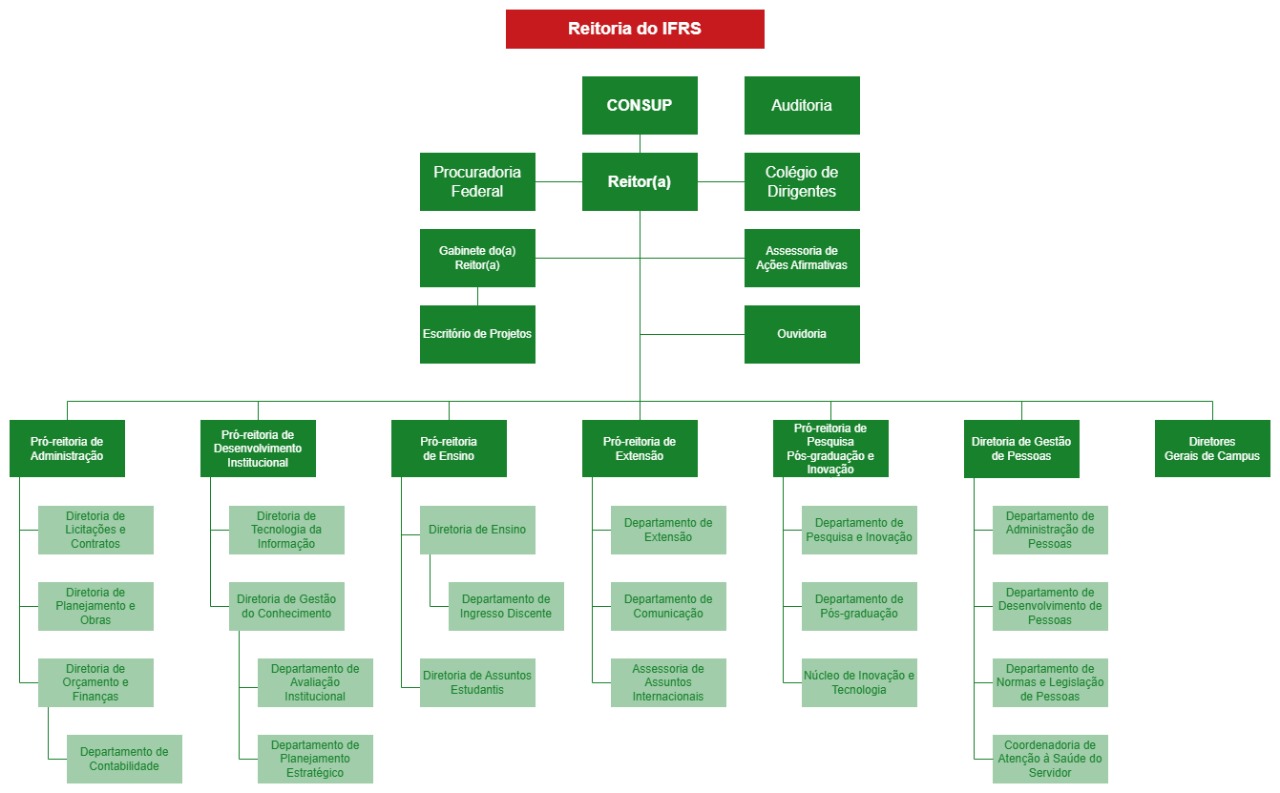 Esta seção reúne e divulga, de forma espontânea, dados do Instituto Federal de Educação Ciência e Tecnologia do Rio Grande do Sul (IFRS), que são de interesse coletivo com o objetivo de facilitar o acesso à informação pública, conforme determina a Lei de Acesso à Informação (Lei 12.527, de 18/11/2011). Compreende as funções, competências, estrutura organizacional, relação de autoridades (quem é quem), agenda de autoridades, horários de atendimento, e legislação do órgão/entidade.
