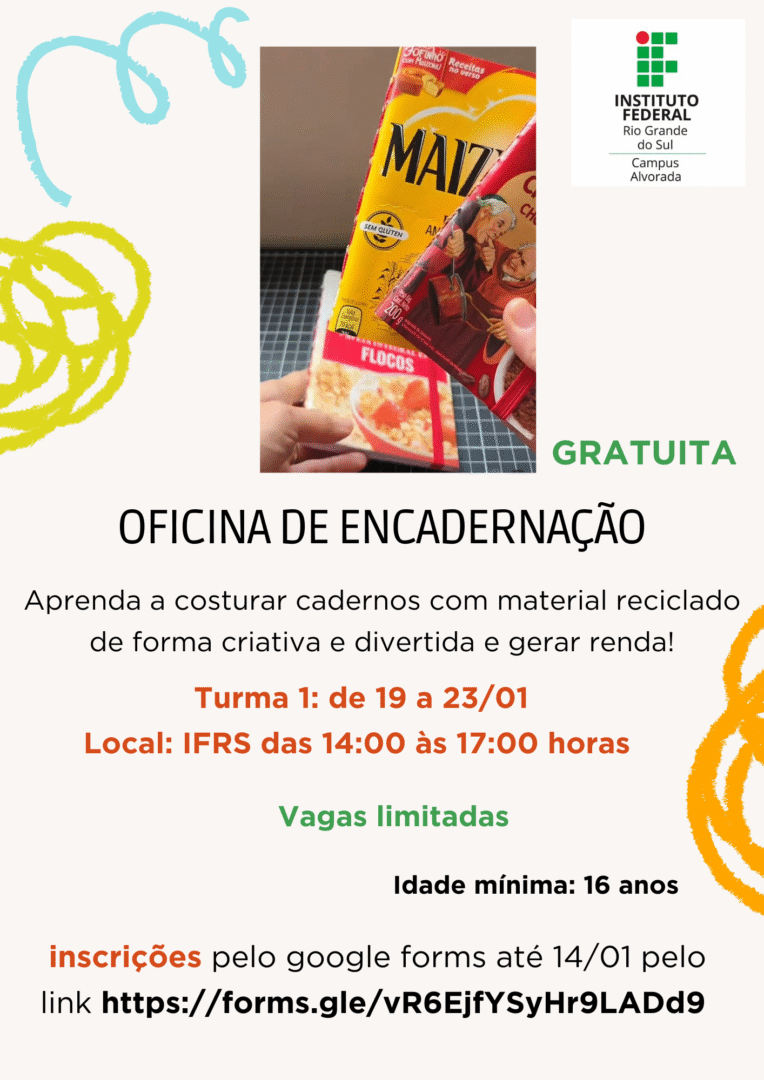 O IFRS Campus Alvorada promove, entre os dias 19 e 23 de janeiro, a Oficina de Encadernação, uma atividade gratuita voltada à comunidade. A oficina tem como objetivo ensinar técnicas de costura e encadernação de cadernos utilizando materiais reciclados, incentivando a criatividade, a sustentabilidade e a possibilidade de geração de renda. A proposta é apresentar alternativas práticas e acessíveis para…