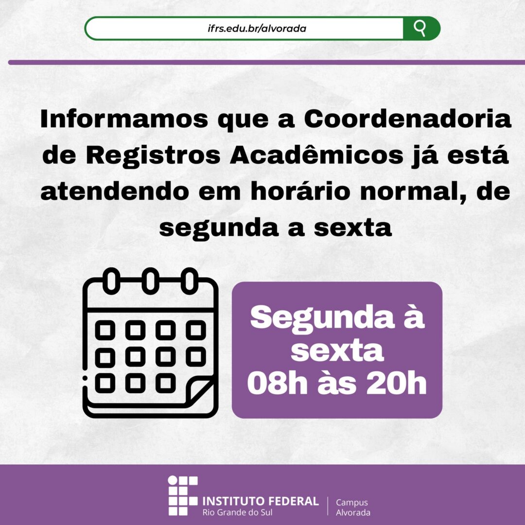 Após o período de recesso institucional, a Coordenadoria de Registros Acadêmicos (CRA) do IFRS Campus Alvorada retoma suas atividades nesta segunda-feira, 12 de janeiro de 2026. O atendimento ao público volta a ocorrer em horário normal, de segunda a sexta-feira, das 08h00 às 20h00. A CRA permanece à disposição da comunidade acadêmica para a realização de seus serviços e esclarecimento de dúvidas