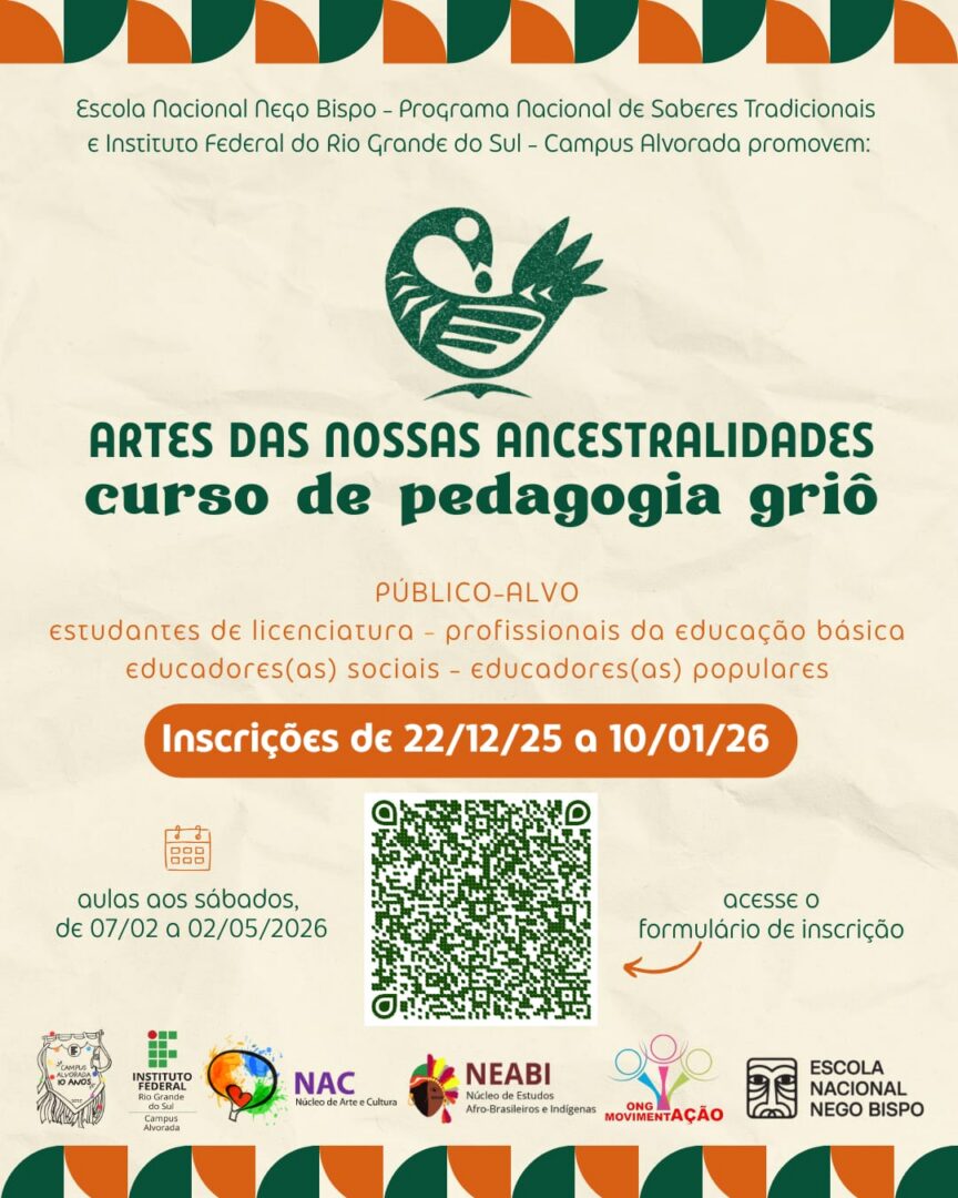 O IFRS Campus Alvorada está com inscrições abertas para o curso de extensão “Artes das Nossas Ancestralidades: Curso de Pedagogia Griô”, iniciativa que integra o Programa Escola Nacional Nego Bispo de Saberes Tradicionais. A proposta visa fortalecer a valorização dos saberes tradicionais afro-brasileiros, da oralidade, da memória e da arte como práticas pedagógicas, contribuindo para o enfrentamento ao racismo e ao epistemicídio nas instituições de ensino.