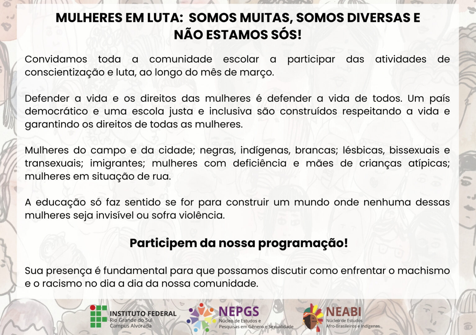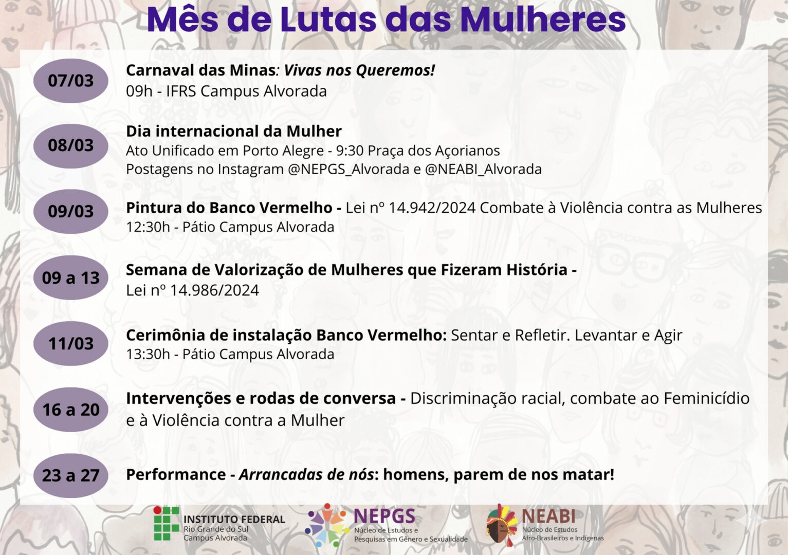 O Núcleo de Estudos e Pesquisas em Gênero e Sexualidade (Nepgs) e do Núcleo de Estudos Afro-Brasileiros e Indígenas (Neabi), convida a todos — estudantes, servidores e colaboradores — para participarem das atividades do Mês de Luta das Mulheres, que ocorrerão ao longo de março no IFRS Campus Alvorada.