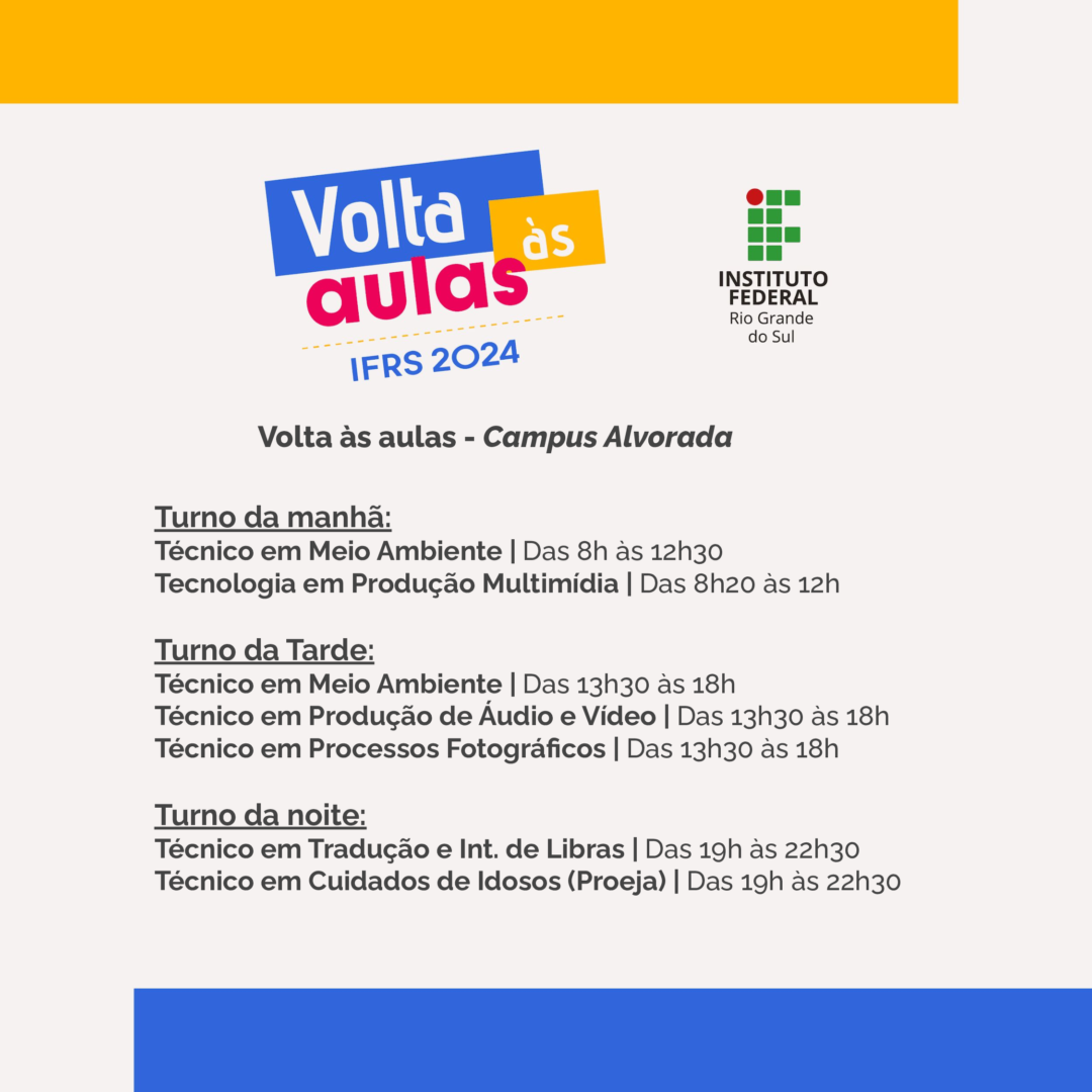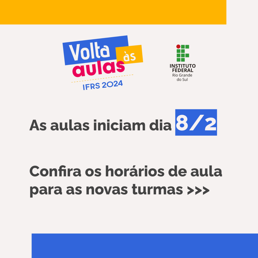 Conforme Calendário Acadêmico do Campus Alvorada do IFRS, o início das aulas do 1º semestre de 2024 está marcado para o dia 8 de fevereiro.