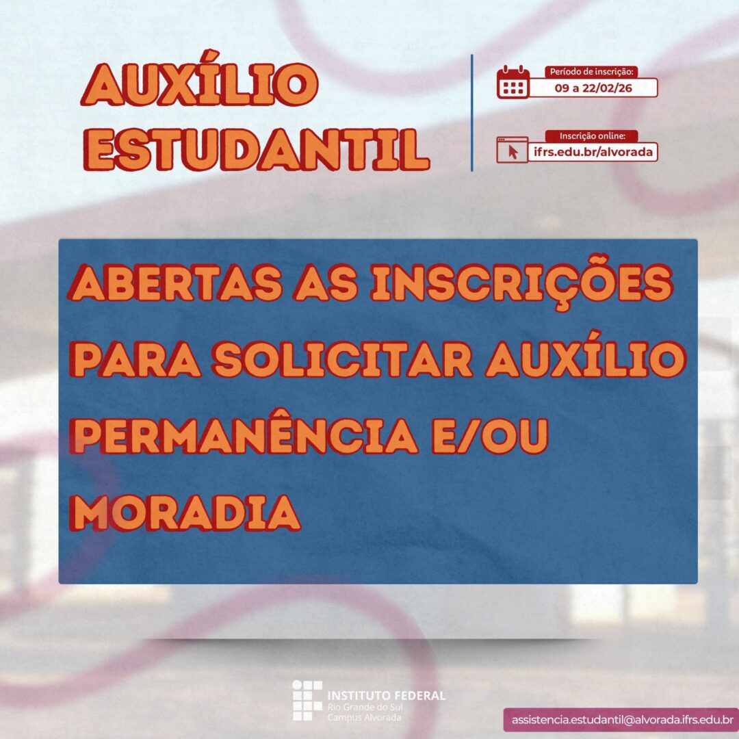 A Assistência Estudantil do IFRS Campus Alvorada informa que novas inscrições para solicitar Auxílio Permanência e/ou Moradia estão abertas.