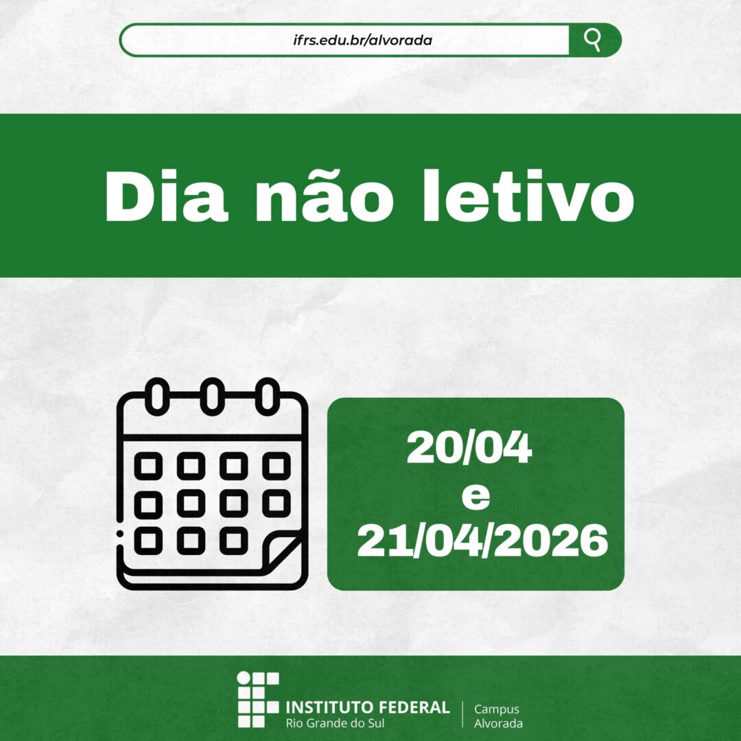 O IFRS Campus Alvorada informa que os dias 20 e 21 de abril não serão dias letivos no campus, conforme previsto pelo Calendário Acadêmico vigente (dia 20) e ao feriado de Tiradentes (dia 21). O atendimento presencial será retomado na quarta-feira, 22 de abril.