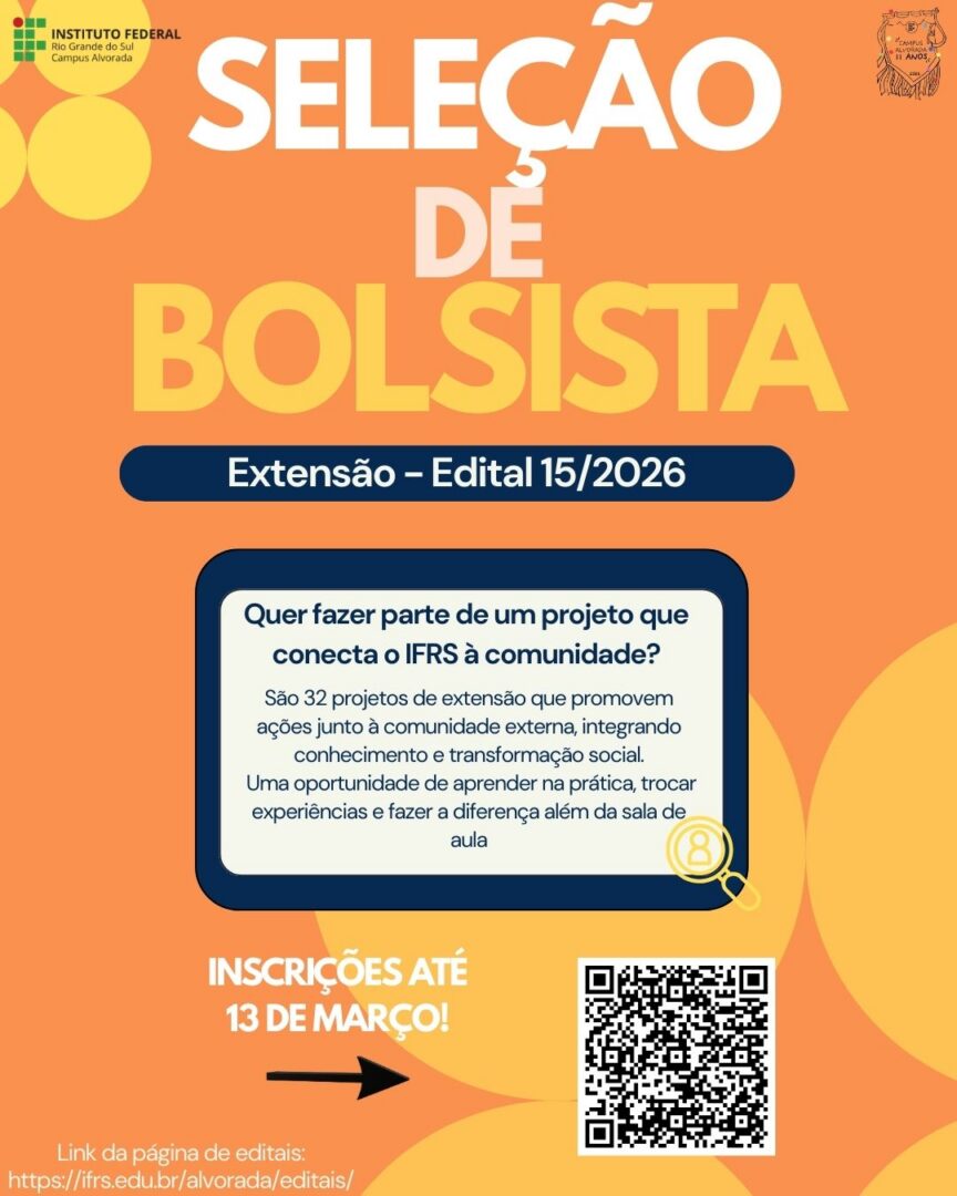Encerraram-se nesta quinta-feira, 5 de março, as inscrições para os editais de bolsas de Pesquisa, Ensino e Projetos Indissociáveis do IFRS Campus Alvorada.