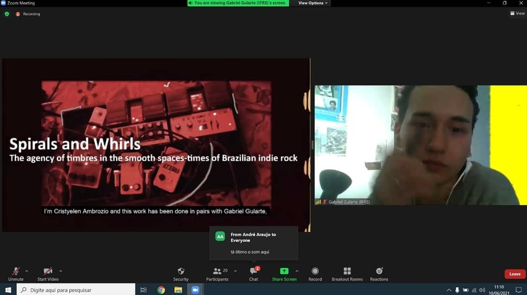 De acordo com o discente, a explanação foi um recorte do seu artigo produzido para a conclusão da bolsa e busca compreender como a musicista Desirée Marantes atua ao utilizar instrumentos em suas apresentações ao vivo, que são gravadas. “Desirée utiliza um pedal de “looping” que ao tocar faz com que o som se repita formando uma composição, com isso ela vai adicionando diferentes instrumentos como: violino, guitarra e teclado. Criando essa massa sonora que só é possível em suas apresentações ao vivo, sendo assim, compreendemos que a relação de Desirée se dá entre a organicidade da sua atuação junto de seus instrumentos, que às vezes atuam de forma independente, pois nem sempre ela tem domínio sobre eles. Permitindo imprevisibilidades, criando um território, um espaço onde Desirée se constitui através das diferentes camadas sonoras e desse atrito da mecanização com a organicidade”, relatou o estudante.