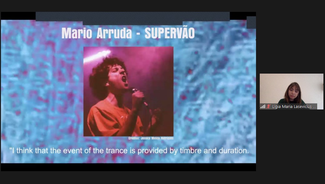 A discente Juliana Henriques Kolmar – também integrante do projeto desde 2018 – enfatizou que o objetivo do trabalho “Transe, êxtase e introspecção: a escuta de blocos de sensação do rock independente brasileiro” foi de entender o papel das timbragens na formação de blocos sonoros que induzem músicos e audiências a estados de alteração de percepção similares ao êxtase e ao transe, responsáveis por potencializar sentidos e criação de perceptos durante performances musicais de bandas analisadas. “Além de pesquisar sobre os shows, nós mapeamos as entrevistas realizadas com os artistas durante os anos de pesquisa”, ressaltou.
