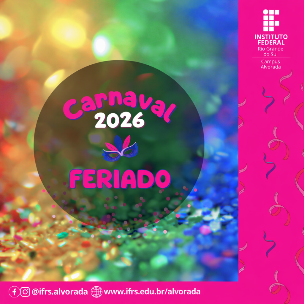 A direção do Campus Alvorada do IFRS informa que não haverá aula e nem atendimento ao público entre os dias 16 e 18 de fevereiro, conforme previsto no Calendário Acadêmico (feriado de Carnaval).