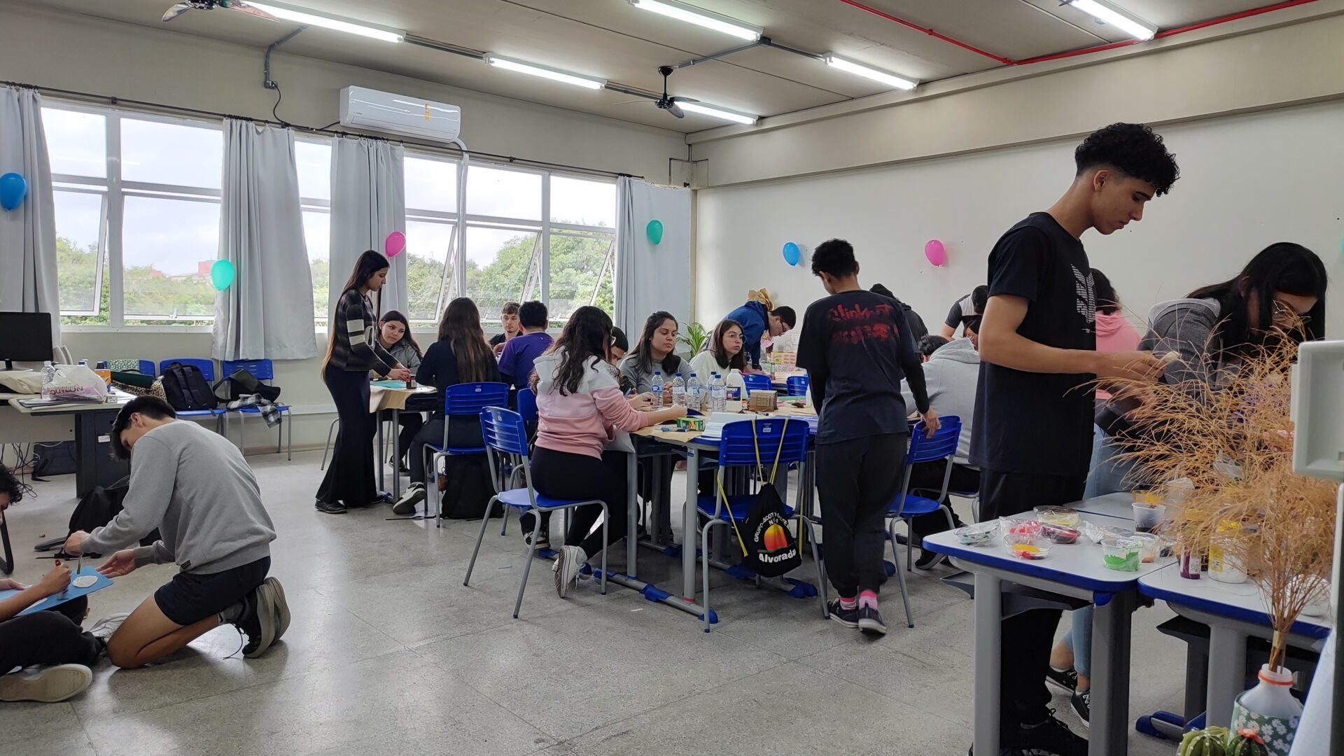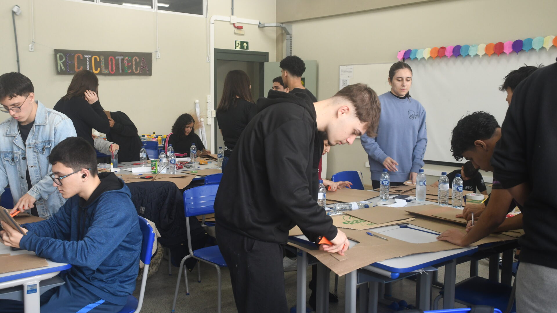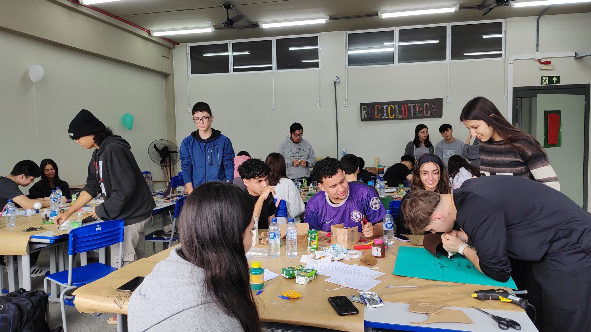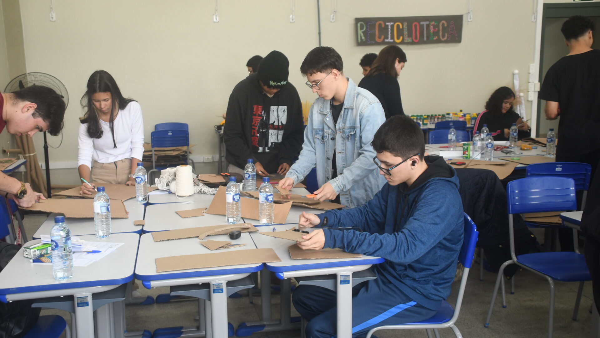 Durante a oficina, os estudantes Isabela, Eduarda, João e Renan conversaram sobre os resíduos sólidos urbanos enfatizando a necessidade de reduzir, reutilizar e reciclar nossos resíduos. Além disso, houve a explicação sobre os conceitos da responsabilidade compartilhada e a logística reversa. A oficina propôs uma atividade de experimentação, onde os alunos confeccionaram autorretratos reutilizando papelão e construíram murais retratando a demanda de recursos naturais para a fabricação de papel.