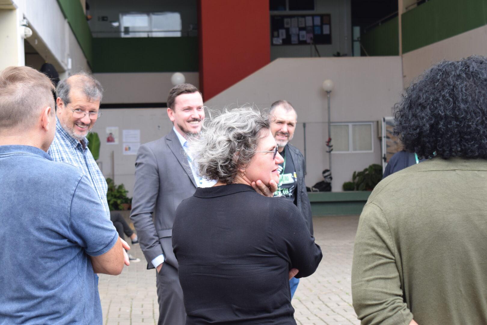 A visita também contou com a presença da deputada estadual Stela Farias, da vereadora Giovana Thiago e do Pró-reitor de Desenvolvimento Institucional do IFRS, Lucas Coradini, representando o Reitor do IFRS e o Pró-reitor de Ensino, Fábio Marçal, reforçando o compromisso conjunto com o fortalecimento da educação pública, gratuita e de qualidade.