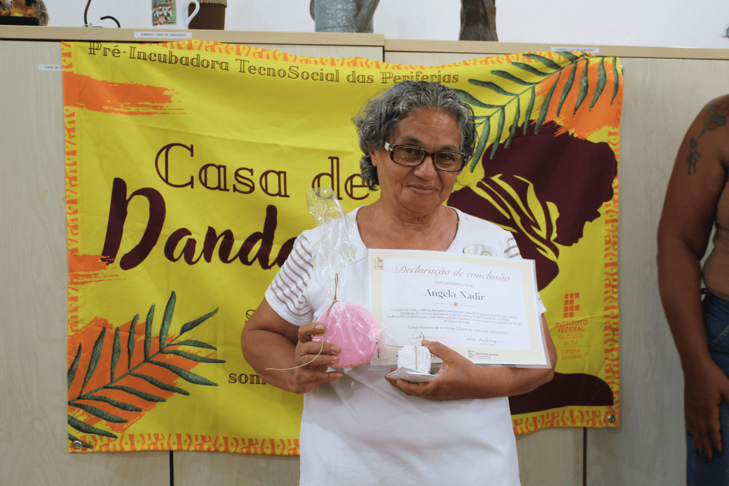 Ao longo do último dia de aula, as estudantes realizaram atividades práticas e receberam kits de materiais utilizados em técnicas manuais de costura, como o fuxico, organizados em estojos que integram o rol de itens recebidos por meio da ação nacional Receita por Elas, da Receita Federal, que contemplou o Programa Casa de Dandaras e o Programa Mulheres Mil. Os kits correspondem aos materiais efetivamente trabalhados durante a oficina, compondo o produto pedagógico da formação e possibilitando a continuidade das práticas desenvolvidas a partir dos conhecimentos técnicos adquiridos.