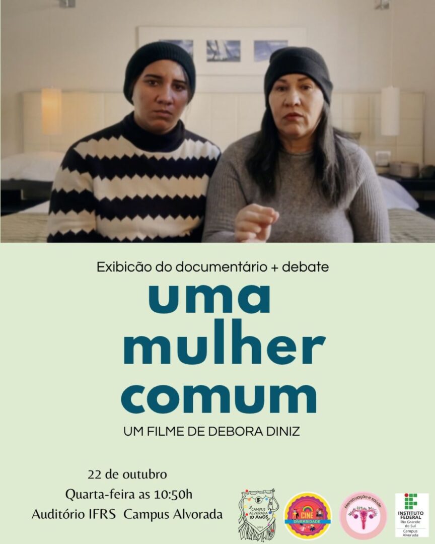 Projeto de Ensino “Cine Diversidade: gênero, sexualidade e diversidade étnico-cultural” convida a todos participarem no dia 22/10 (quarta-feira) às 10h50min para assistir a exibição do documentário “Uma mulher comum” de Debora Diniz no auditório do campus. Após o filme, haverá um debate sobre o filme com os presentes.