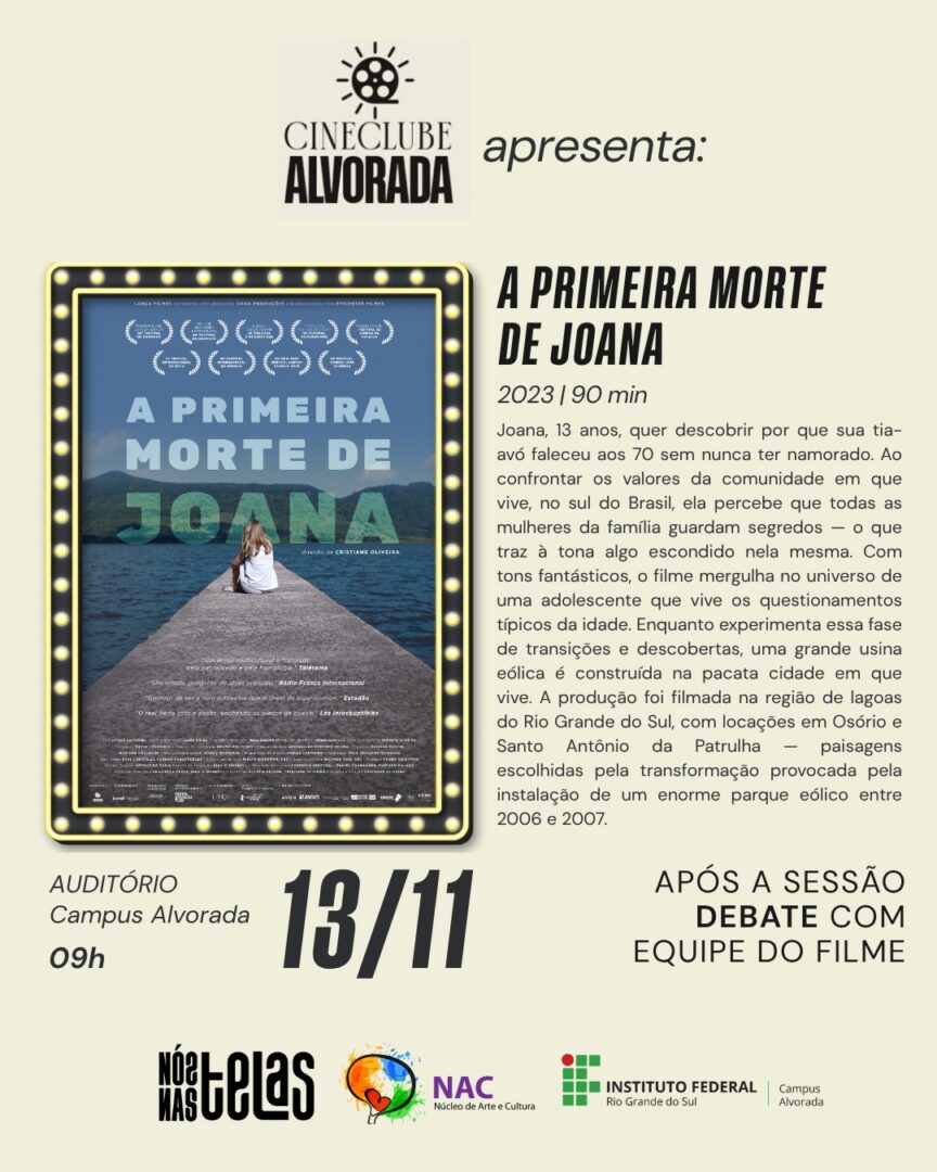 O Cineclube Alvorada realiza, nesta quinta-feira, 13 de novembro, às 9h, a exibição do longa-metragem “A Primeira Morte de Joana”, no auditório do Campus Alvorada. A atividade é aberta ao público e faz parte das ações do Núcleo de Arte e Cultura (NAC) e do projeto “Nós nas Telas”.