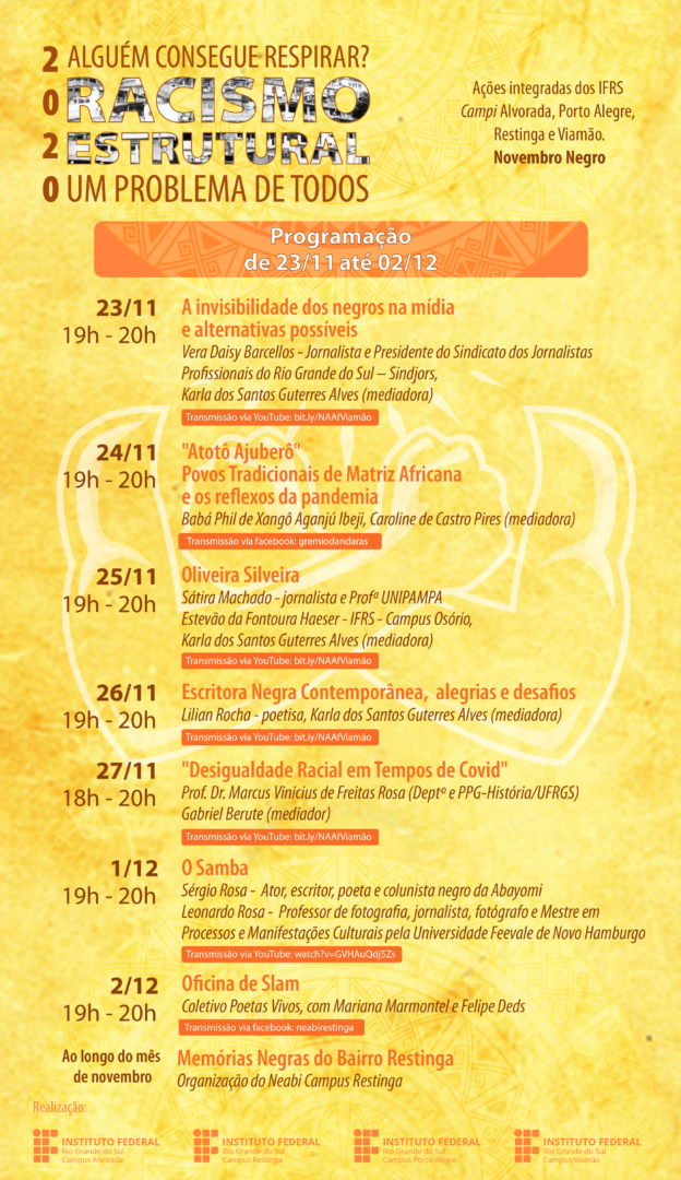 23/11/2020 – 19h – A invisibilidade dos negros na mídia e alternativas possíveis, com Vera Daisy Barcellos Costa – Presidente do Sindicato dos Jornalistas Profissionais do Rio Grande do Sul (Sindjors) e Karla dos Santos Guterres Alves (mediadora). Transmissão pelo canal do YouTube do Naaf do Campus Viamão.