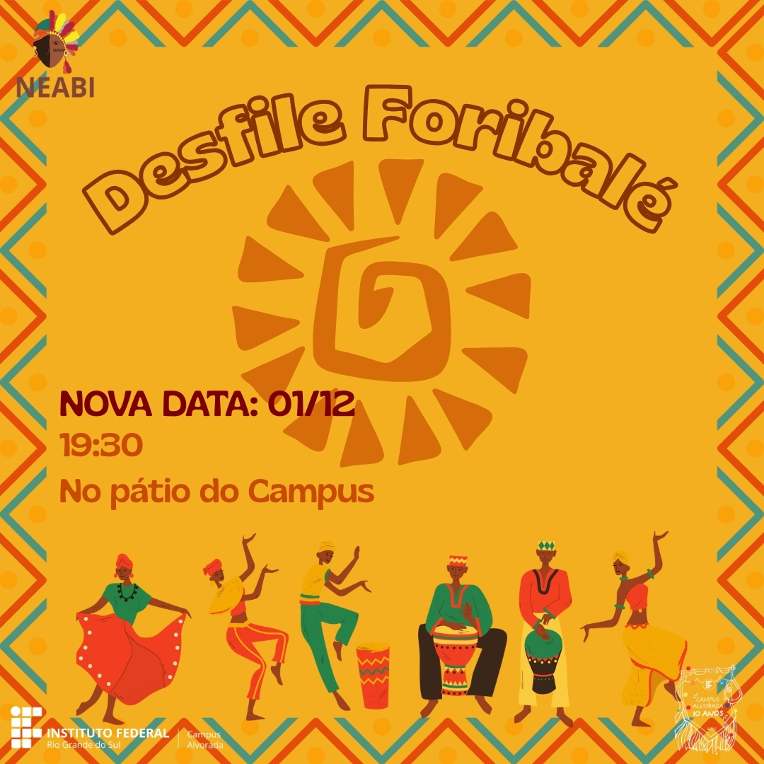 O IFRS Campus Alvorada informa que o Desfile Foribalé, atividade integrante da programação do Novembro Negro, foi remarcado para o dia 1º de dezembro, às 19h30min, no pátio do campus.