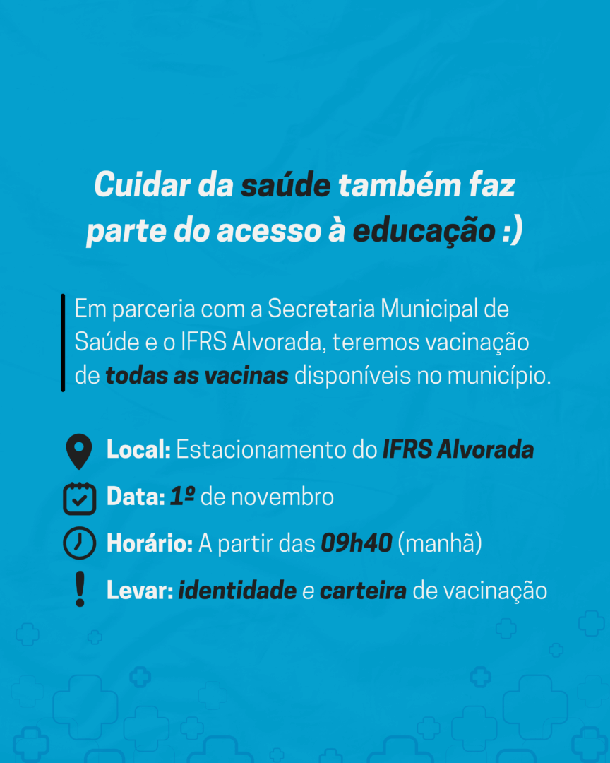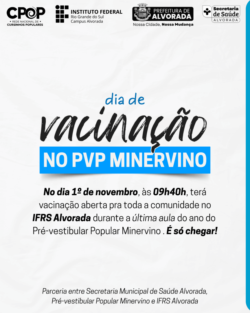 No dia 1º de novembro, a partir das 09h40 às 11h, vai acontecer uma ação de vacinação no IFRS Campus Alvorada, organizada pelo Pré-Vestibular Popular Minervino 💙