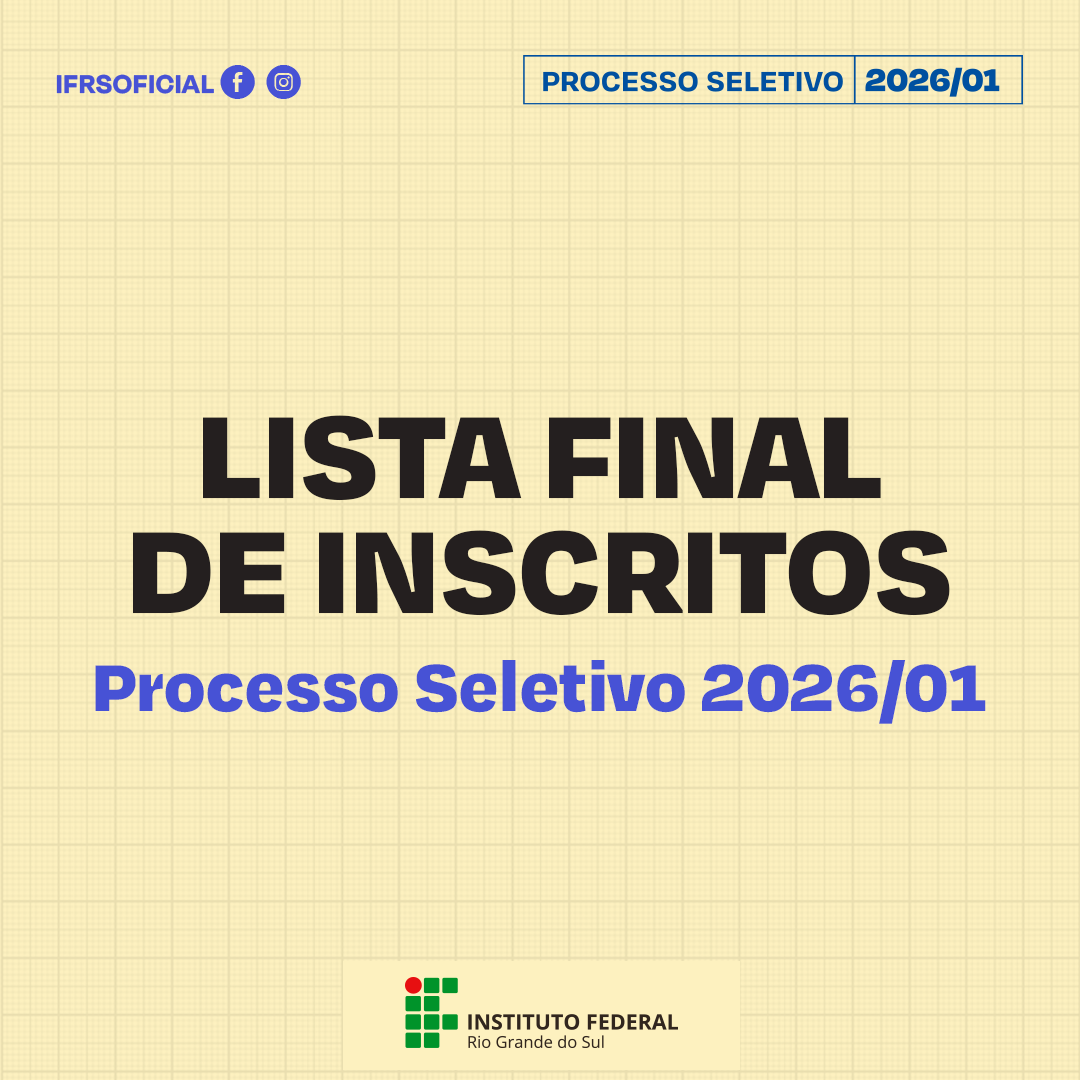Foi divulgada nesta quarta-feira, 22 de outubro, a lista final de inscrições confirmadas (homologadas) de candidatos que irão participar do Processo Seletivo 2026/01 do do Instituto Federal de Educação, Ciência e Tecnologia do Rio Grande do Sul (IFRS).