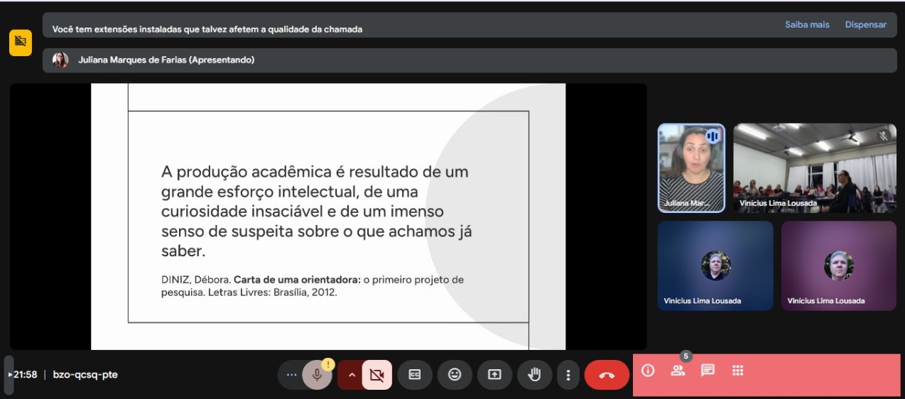 A docente abordou os desafios envolvidos na elaboração de um projeto de pesquisa, tanto na graduação quanto na pós-graduação, especialmente no que diz respeito à definição do tema e à organização pessoal do estudante em relação à redação científica. Foram compartilhadas dicas relevantes para a produção do texto acadêmico, com destaque para o estilo de escrita, a ilusão do perfeccionismo na produção textual, a necessidade de planejamento do tempo de estudo e de organização pessoal necessária para a construção do projeto, além do cronograma do projeto de pesquisa.