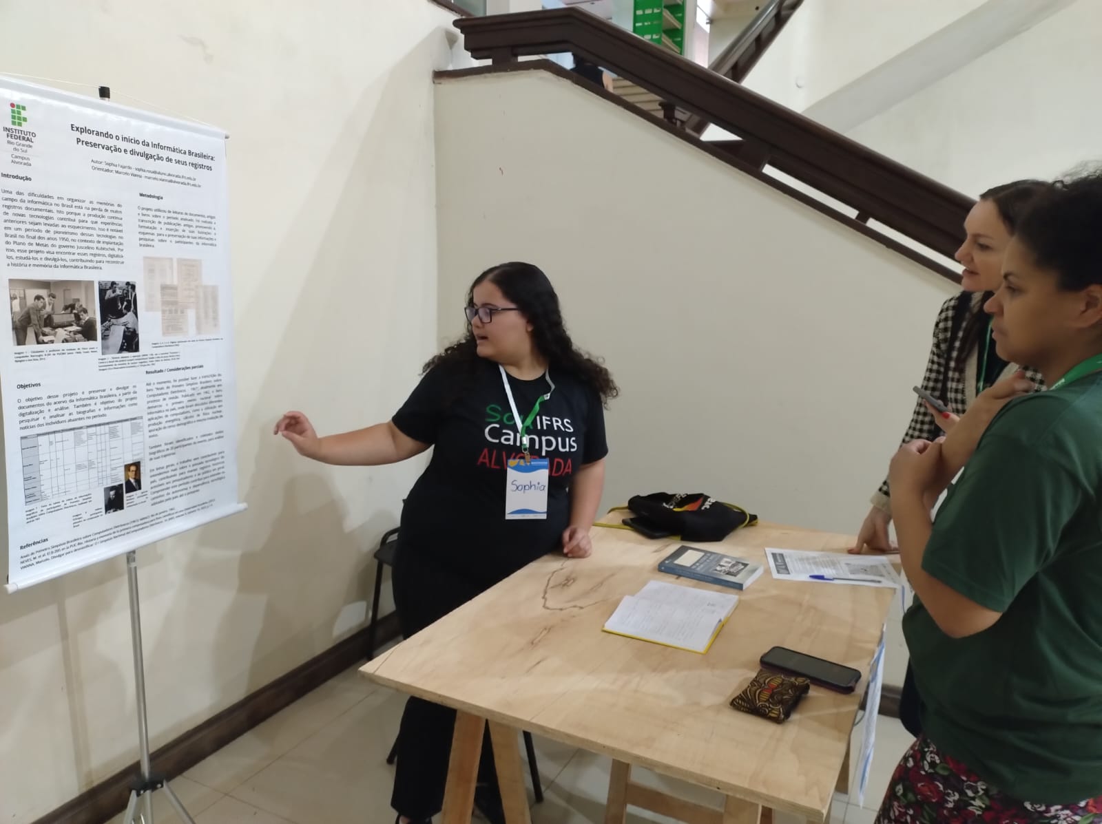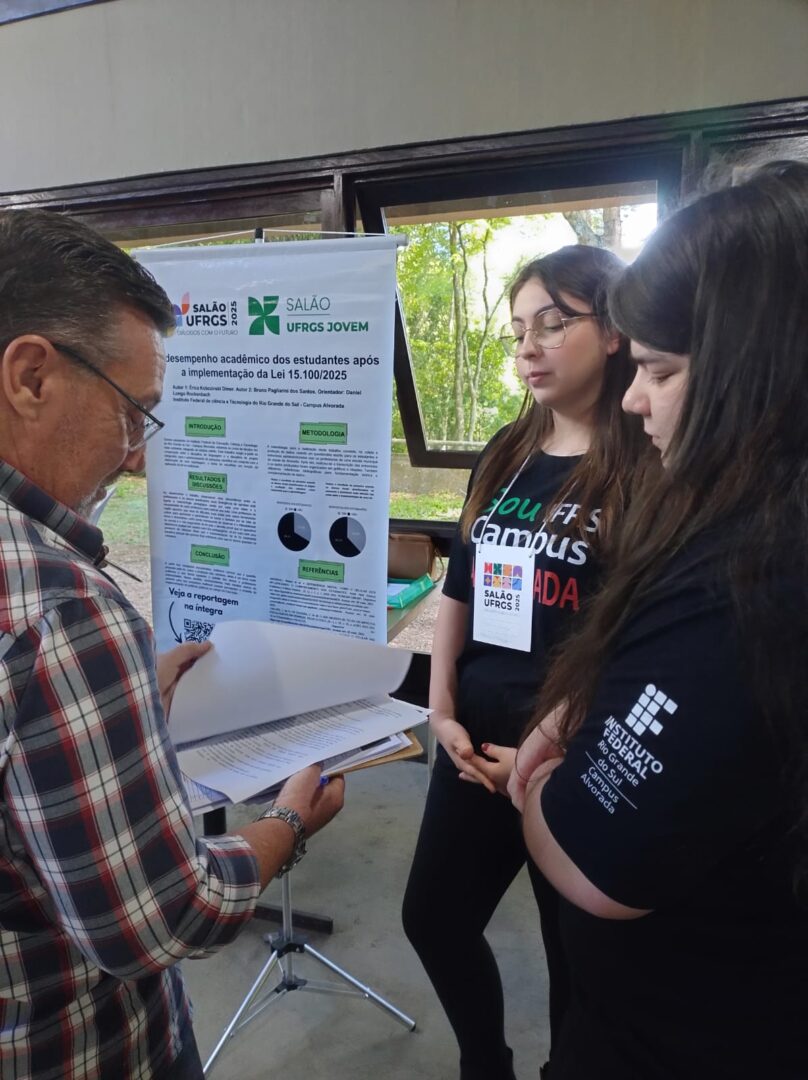Nos dias 20 e 21 de outubro, o campus Alvorada esteve presente, junto com outros campi do IFRS, no Salão da UFRGS 2025: no primeiro dia (21/10), durante o Salão de Iniciação Científica, a estudante Rosemar da Silva (Superior de Tecnologia em Produção Multimídia) apresentou o trabalho “Cultura em ação: estudos e práticas em produção e difusão cultural”, enquanto os bolsistas externos Elias Pereira, Ana Júlia Domingues e Malu Saturno, apresentaram trabalhos vinculados ao projetos de pesquisa desenvolvidos pelo IFRS Campus Alvorada na área da digitalização de acervos e História Pública. Por sua vez, no segundo dia, , estiveram novamente presentes as estudantes Bianca Bernardino e Manoela Bruhn com trabalhos relativos à memória institucional e acervos digitais. Os estudantes Érica Kobczinski Dimer e Bruno Pagriarini dos Santos, por sua vez, trouxeram uma pesquisa que explorou o impacto da restrição do uso de celulares no desempenho acadêmico dos estudantes.