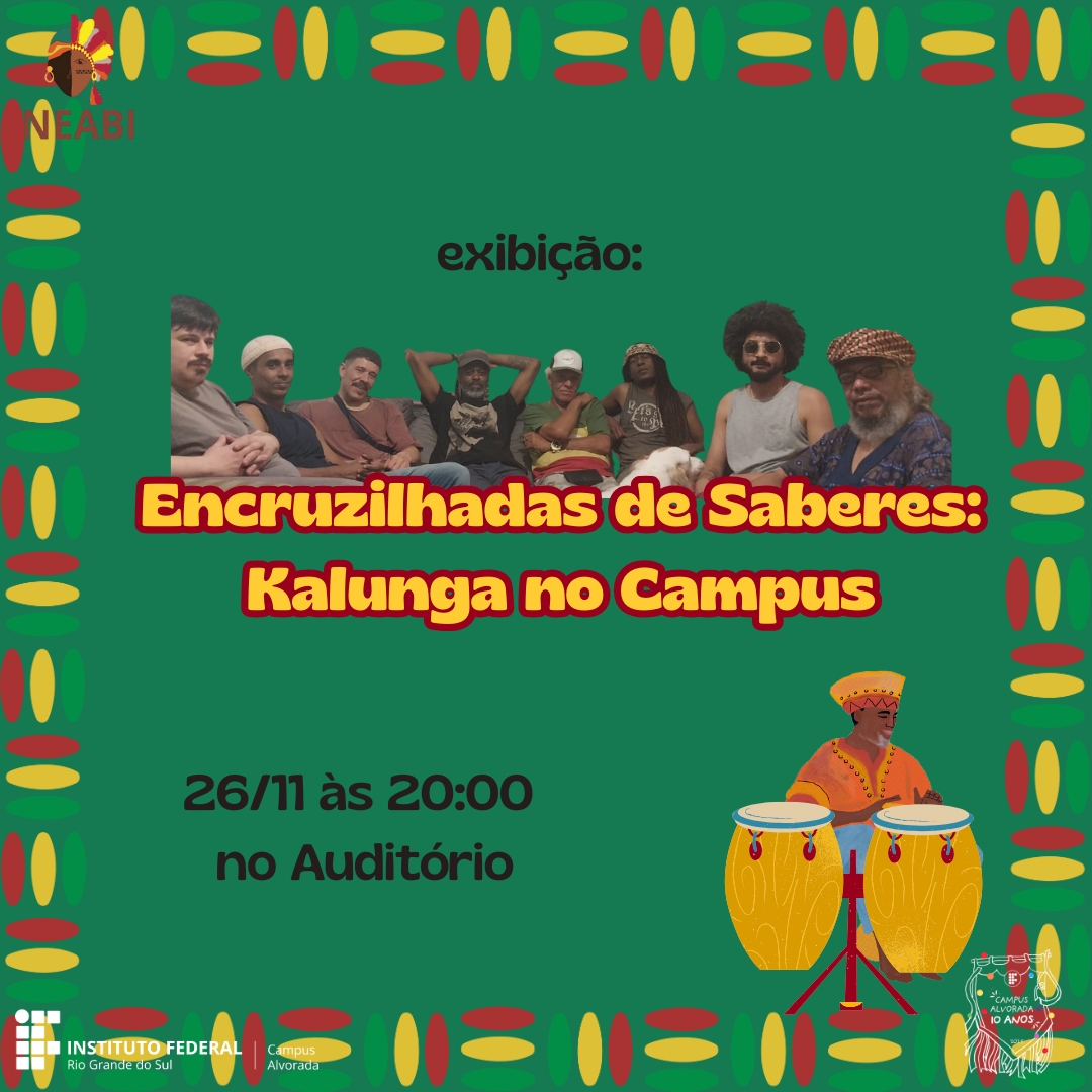 O IFRS Campus Alvorada recebe nesta quarta-feira, 26 de novembro, a exibição “Encruzilhadas de Saberes: Kalunga no Campus”, uma atividade que integra a programação do Novembro Negro. O encontro ocorre às 20h, no auditório da instituição.