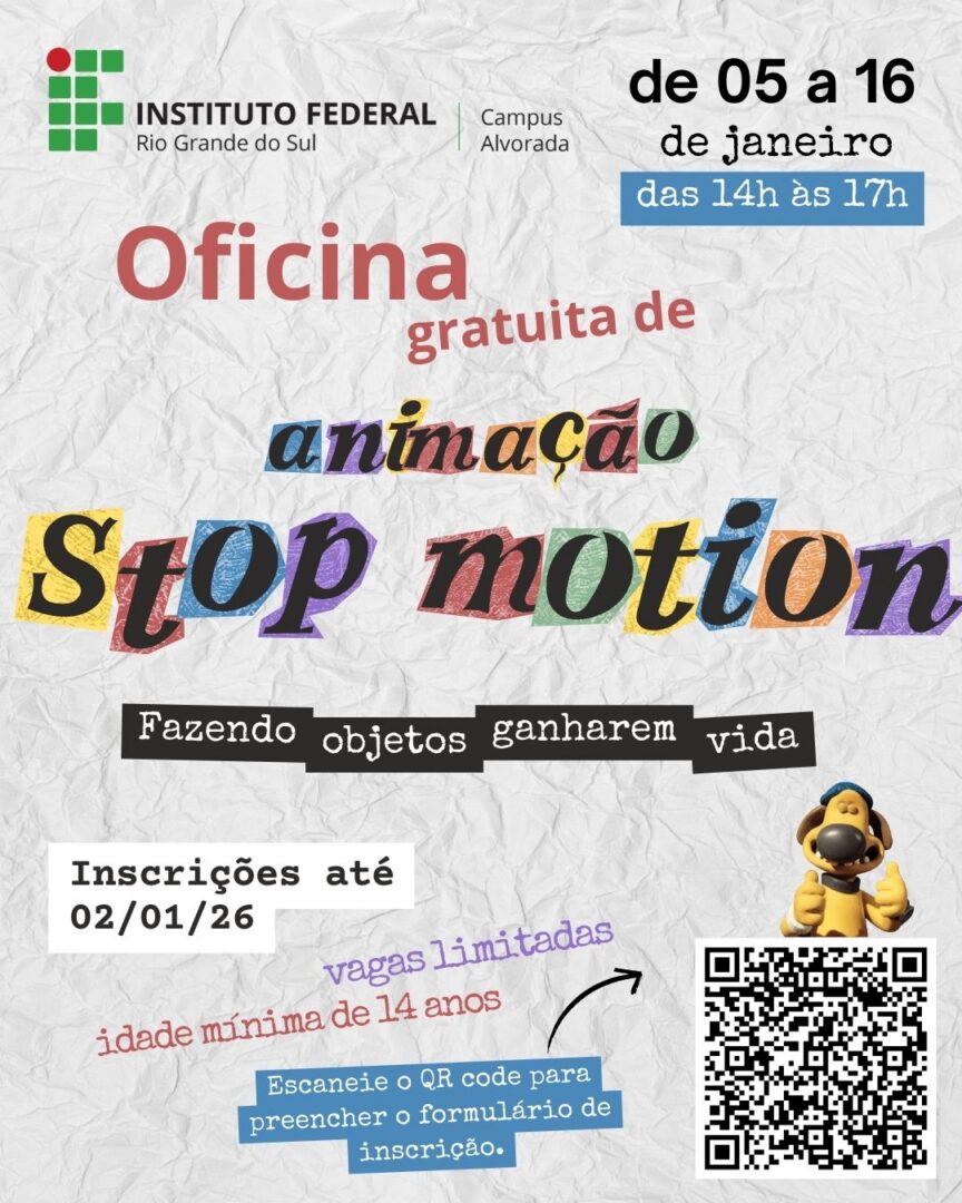 O IFRS Campus Alvorada está com inscrições abertas para a oficina gratuita “Animação Stop Motion: Fazendo Objetos Ganharem Vida”, uma atividade de extensão voltada ao público a partir de 14 anos. A formação ocorrerá entre os dias 05 e 16 de janeiro, das 14h às 17h.