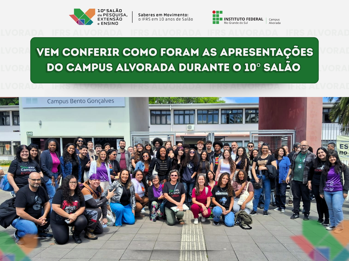 Nos dias 17 e 18, o IFRS Campus Alvorada integrou a programação do 10º Salão de Pesquisa, Extensão e Ensino do IFRS, realizado no Campus Bento Gonçalves. O evento reuniu estudantes, servidores e comunidade acadêmica em dois dias dedicados à troca de experiências, ao compartilhamento de resultados e ao fortalecimento das ações desenvolvidas nos campi.