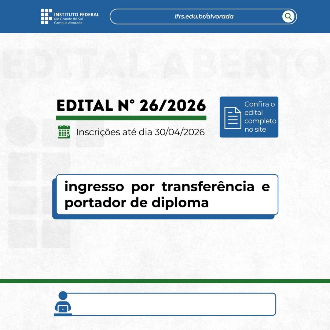 O IFRS Campus Alvorada publicou o Edital nº 26/2026, que regulamenta o processo de ingresso de estudantes por transferência interna, transferência externa e para portadores de diploma em cursos técnicos subsequentes e cursos superiores.