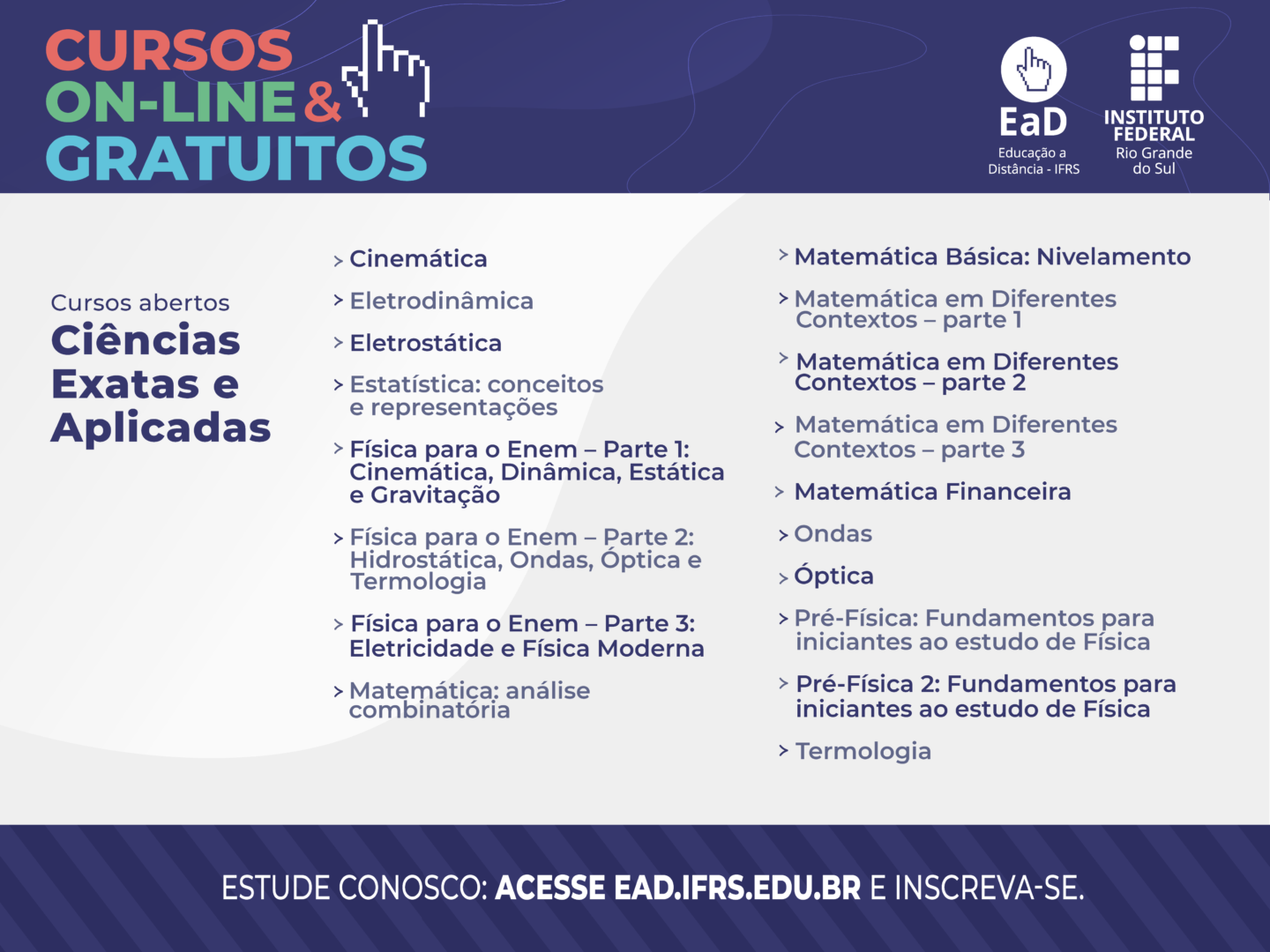 Gosta de matemática, física, cinemática, estatística, eletrostática…? Então não perca essa oportunidade que o Instituto Federal do Rio Grande do Sul (IFRS) traz para você. São 18 cursos de Educação a Distância na área de Ciências Exatas e Aplicadas. E o melhor, totalmente gratuito, com aulas abertas a todos os interessados (não é necessário ser estudante do IFRS) e realizadas em ambiente virtual. Não há encontros presenciais ou com hora marcada, ou seja, o estudante faz o curso quando tiver disponibilidade. Ao término, é concedido certificado para os aprovados.