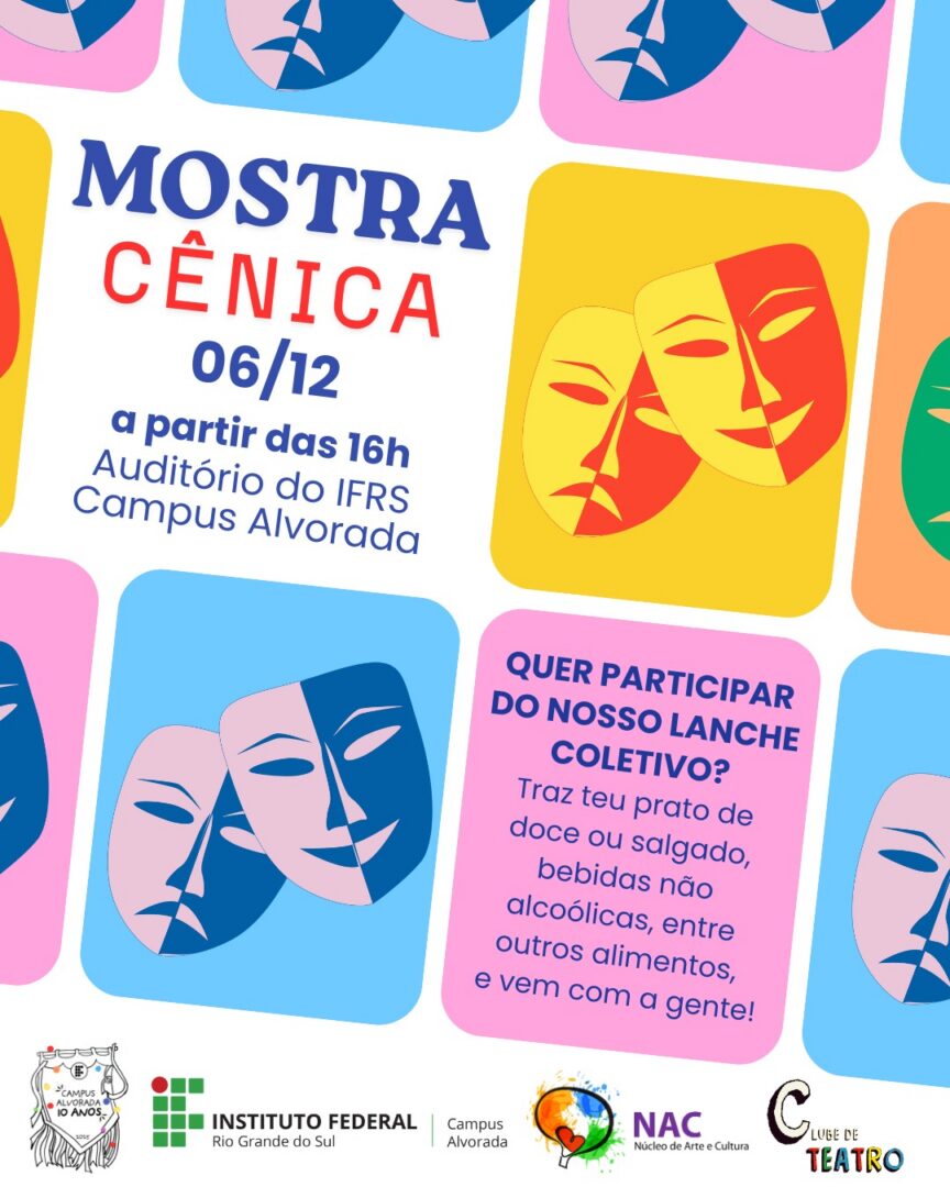 O Núcleo de Arte e Cultura (NAC) do IFRS Campus Alvorada realizará, neste sábado, 06 de dezembro, a partir das 16h, a Mostra Cênica 2025, no auditório do Campus (Rua Professor Darcy Ribeiro, 121). O evento é aberto ao público e celebra as criações artísticas desenvolvidas ao longo do ano nas oficinas de teatro.