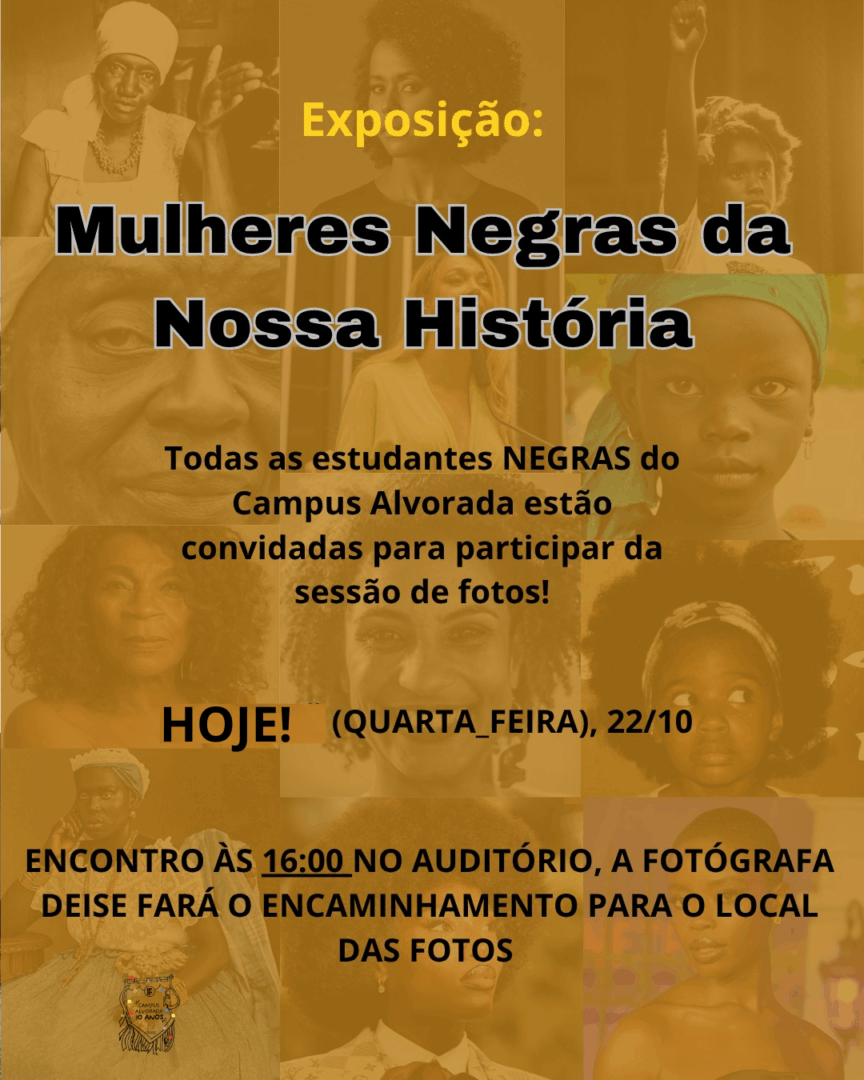 Para essa exposição, convidamos todas as estudantes negras que quiserem participar para estarem amanhã (quarta-feira, 22/10) no auditório às 16 horas. A sessão de fotos ocorrerá logo após a Roda de Conversa Vozes Indígenas, (se você já estiver no auditório, ótimo, porque o Vozes será um evento imperdível). A fotógrafa Deise estará encaminhando as colegas para o local no campus escolhido para as fotografias. Não é necessária nenhuma produção visual específica, é só chegar.