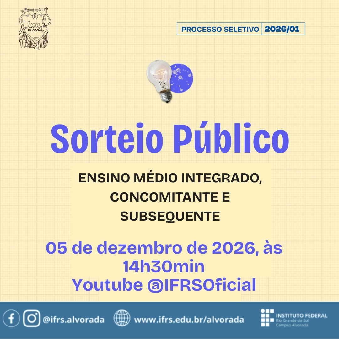 Informamos que o sorteio destinado aos candidatos inscritos nos cursos técnicos das modalidades integrada, concomitante e subsequente ao Ensino Médio do IFRS Campus Alvorada, será realizado em 5 de dezembro de 2025, com início às 14h30min e será transmitido pelo Canal Oficial do IFRS no youtube.