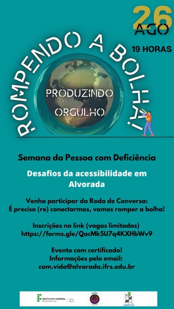 A fim de celebrar a Semana da Pessoa com Deficiência o projeto “Com Vida” do Campus Alvorada promove uma roda de conversa on-line no dia 26 de agosto, das 19h às 21h. O objetivo é dar visibilidade e produzir diálogos sobre os desafios referentes à acessibilidade para pessoas com deficiências no município de Alvorada.