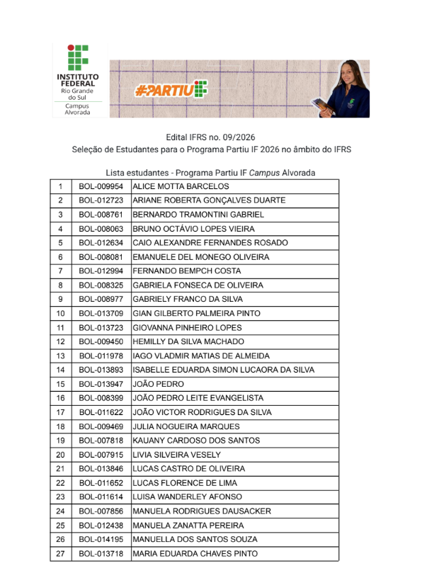 Estudante do programa PartiuIF Campus Alvorada, confira se seu nome está na lista abaixo:
