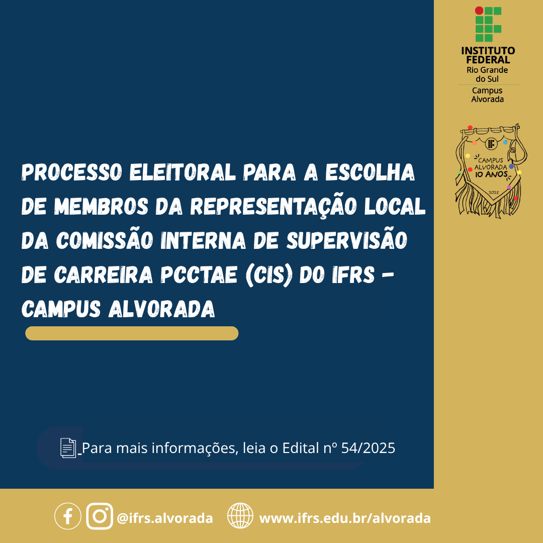 O edital tem por objetivo estabelecer normas e procedimentos necessários à realização da eleição de membros representantes para constituírem a Comissão Interna de Supervisão do Plano de Carreira dos cargos Técnico-Administrativos em Educação (CIS) do Instituto Federal de Educação, Ciência e Tecnologia do Rio Grande do Sul – Campus Alvorada.