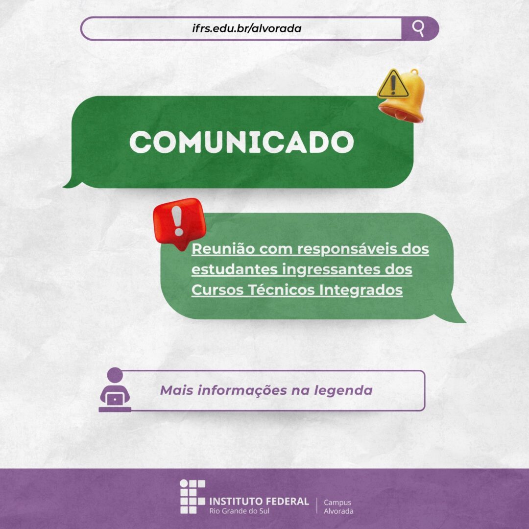 O IFRS Campus Alvorada convida os responsáveis pelos estudantes ingressantes dos Cursos Técnicos Integrados em Meio Ambiente, Áudio e Vídeo e Informática para Internet para uma reunião de acolhimento e orientações sobre o início do ano letivo.