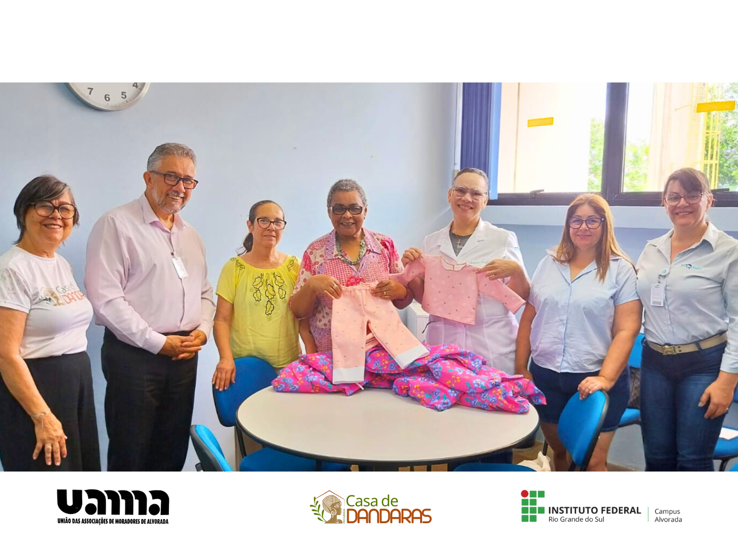 Participaram do momento a instrutora Vera Costa, responsável pela condução do curso de Costura Criativa; Nara Martinez, representando o Programa de Extensão Casa de Dandaras e o Instituto Federal; o diretor do Hospital de Alvorada, Fernando Becker; além de três alunas do curso, que acompanharam a entrega e puderam vivenciar o impacto social de seus aprendizados.