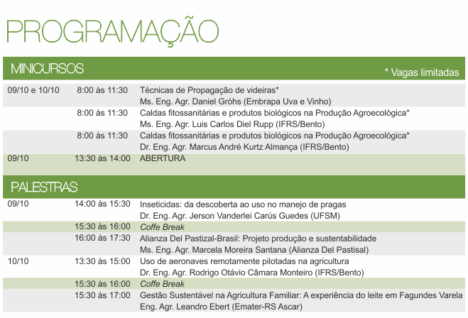 Criado em 2017, este será o primeiro evento organizado pelos estudantes e coordenação do curso. A programação conta com a participação de pesquisadores e profissionais do IFRS, Universidade Federal de Santa Maria, Embrapa Uva e Vinho, Emater Ascar e Alianza Del Pastizal. A Jornada ocorrerá no Salão de Atos do campus Bento Gonçalves nos dias 9 e 10 de outubro.