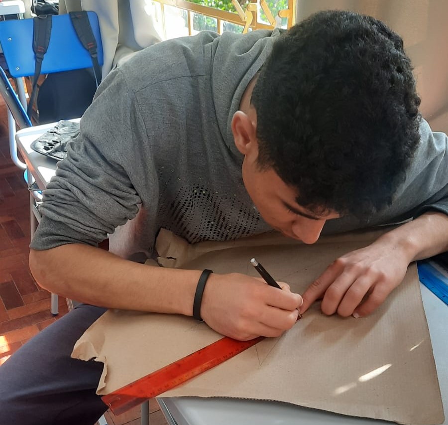 Essa foi uma das atividades do estágio curricular da estudante e foi desenvolvida com uma turma de 2º ano do Ensino Médio, composta por sete alunos que construíram uma maquete do pórtico de entrada da cidade de Fagundes Varela. Para realizar a construção de cada parte da réplica reduzida do monumento, foram utilizadas as definições de polígonos, poliedros e pirâmides, conteúdos trabalhados em aula, explica a professora estagiária.