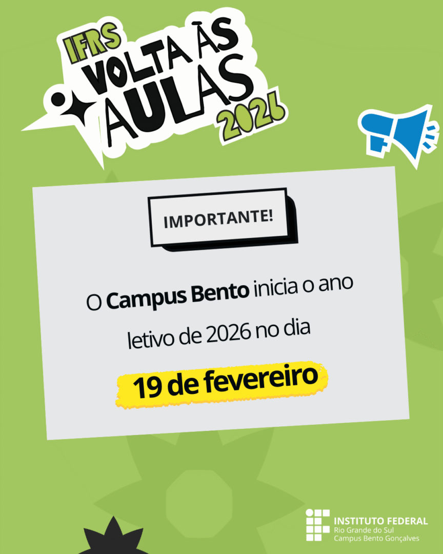 O Campus Bento Gonçalves inicia o ano letivo de 2026 no dia 19 de fevereiro, com o retorno das atividades acadêmicas presenciais para estudantes dos cursos técnicos e superiores.