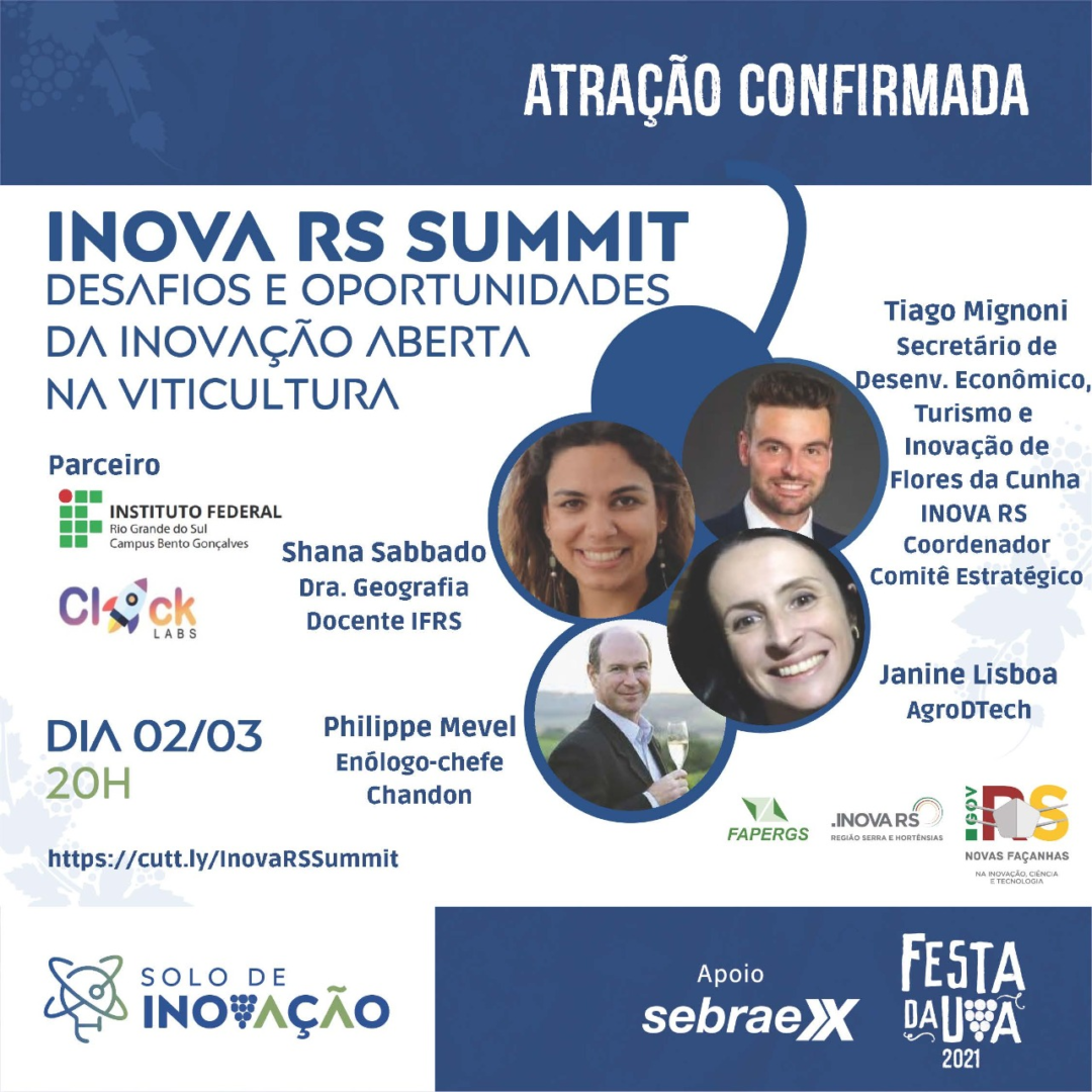 O Campus Bento Gonçalves do IFRS estará representado no espaço Solo de Inovação da 33ª Festa da Uva, no dia 2 de março, com a participação da professora Shana Sabbado Flores, representando o Click – Espaço de Inovação no Inova RS Summit!