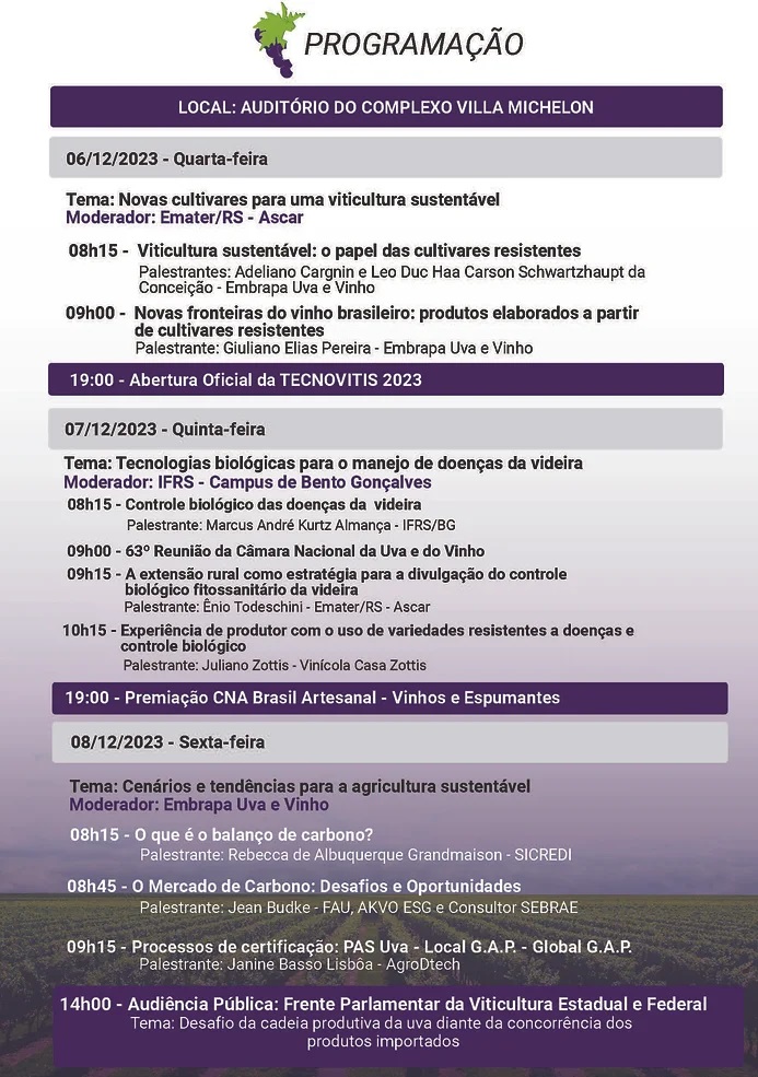 Assim como nas edições anteriores, o Campus Bento Gonçalves do IFRS é um dos apoiadores da Tecnovitis 2023. O evento é promovido pelo Sindicato Rural da Serra Gaúcha e acontece de 6 a 8 de dezembro de 2023, das 10h às 18h, no Vale dos Vinhedos.