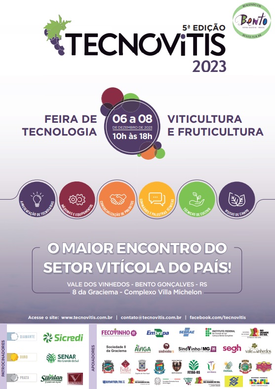 Assim como nas edições anteriores, o Campus Bento Gonçalves do IFRS é um dos apoiadores da Tecnovitis 2023. O evento é promovido pelo Sindicato Rural da Serra Gaúcha e acontece de 6 a 8 de dezembro de 2023, das 10h às 18h, no Vale dos Vinhedos.