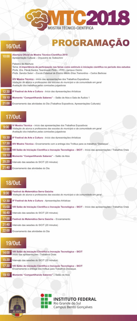 A comissão organizadora da Mostra Técnico-Científica 2018 (MTC 2018), publicou a programação do evento que acontece entre os dias 16 e 19 de outubro. A MTC 2018, é composta por cinco eventos; a XIV Mostra Técnica, o VIII Salão de Iniciação Científica e Inovação Tecnológica, o 9º Festival de Arte e Cultura, o Festival da Matemática Serra Gaúcha e o momento Compartilhando Saberes.