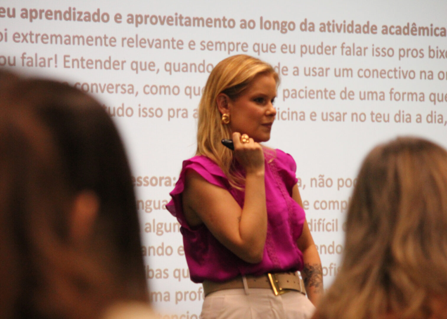 Em sua fala, intitulada “Entre algoritmos e autores: o lugar da escrita acadêmica em tempos de inteligência artificial generativa”, Paola levou os estudantes a refletirem sobre os impactos da inteligência artificial generativa na escrita acadêmica a partir de uma questão central para estudantes de Letras: o que significa ser autor em um contexto em que máquinas também produzem textos? A partir dessa pergunta, a professora propôs uma discussão acerca de algumas das principais preocupações contemporâneas relacionadas ao uso dessas tecnologias, como autoria intelectual, originalidade, integridade acadêmica e pensamento crítico.
