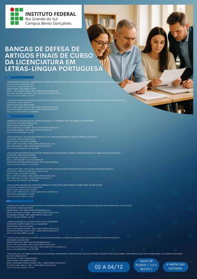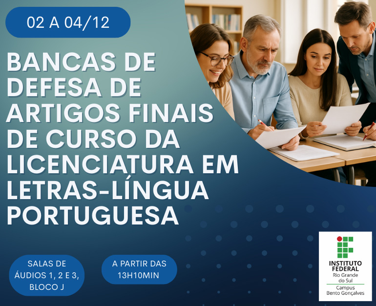 O Curso de Licenciatura em Letras do Campus Bento Gonçalves realizará, entre os dias 02 e 04 de dezembro, a defesa dos artigos de final de curso. O momento representa uma etapa significativa na trajetória acadêmica das turmas do curso e na consolidação das pesquisas produzidas pelos estudantes.