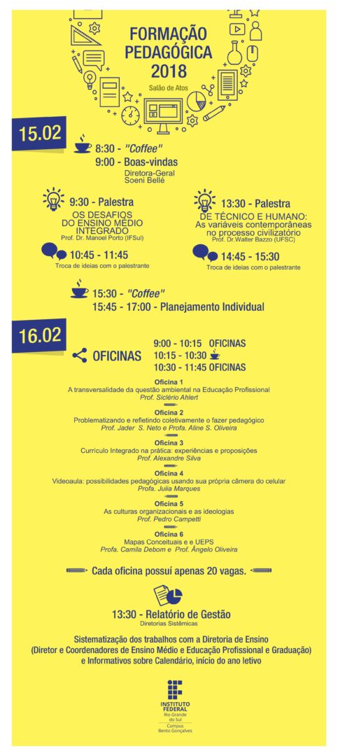 Docentes do Campus Bento Gonçalves partiparam na quinta e sexta-feira, 15 e 16 de fevereiro, da Formação Pedagógica 2018, evento criado pela Direção de Ensino e que busca reintegrar e capacitar os docentes para o início do ano letivo.