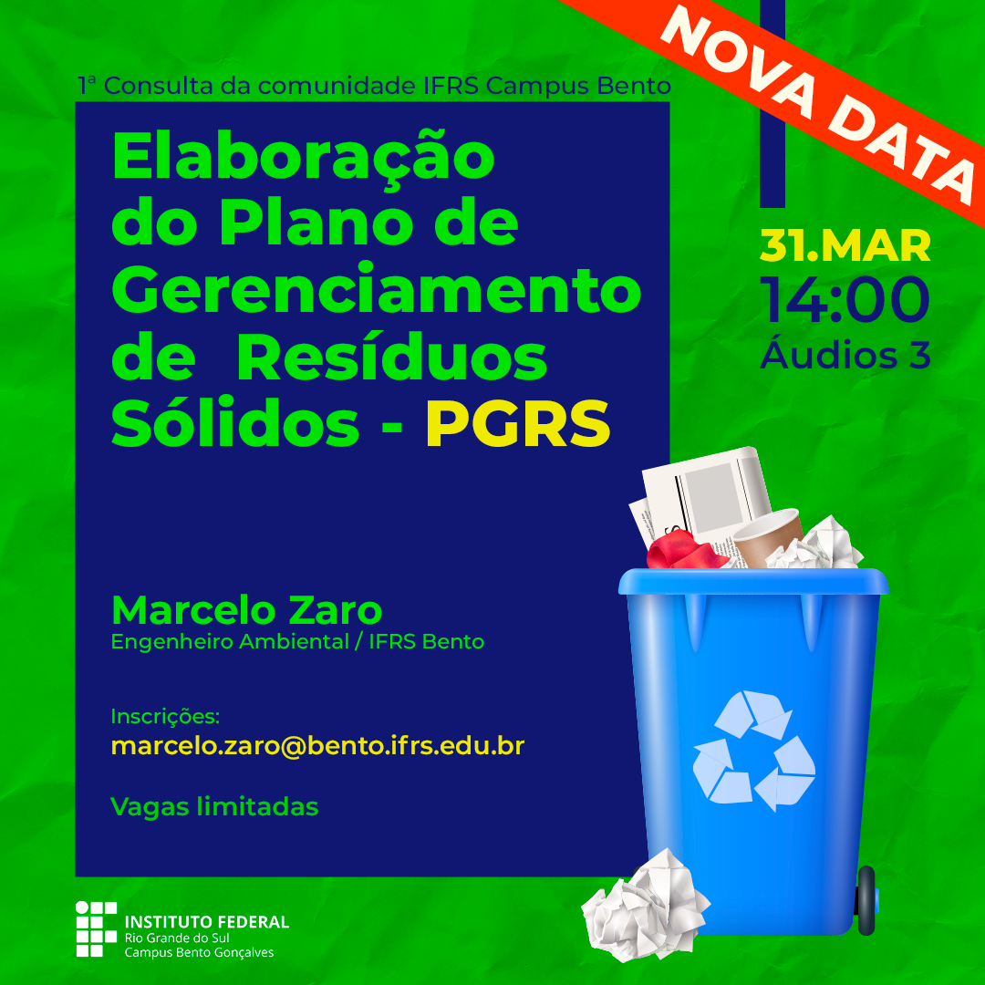 A primeira consulta à comunidade do Campus Bento Gonçalves no processo de elaboração do Plano de Gerenciamento de Resíduos Sólidos (PGRS) acontecerá na quinta-feira, dia 31 de março, às 14h, na Sala de Audiovisuais 3, localizada no bloco da Biblioteca Firmino Splendor. Na ocasião, será apresentada a proposta preliminar e, em seguida, haverá o debate com os presentes. O evento é limitado a 25 pessoas e a confirmação de participação pode ser realizada pelo e-mail marcelo.zaro@bento.ifrs.edu.br até o dia 30, ou enquanto houver vagas.