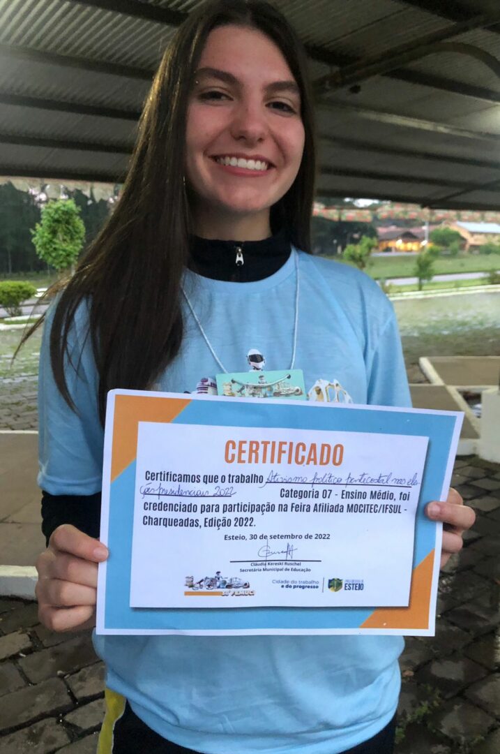 A estudante Bianca Elizabeth Suthoff Lunkes, do 2º ano do Curso Técnico em Meio Ambiente integrado ao Ensino Médio, participou da 30ª Feira Municipal de Ciências e Ideias (Femuci), em Esteio, nos dias 29 e 30 de setembro.