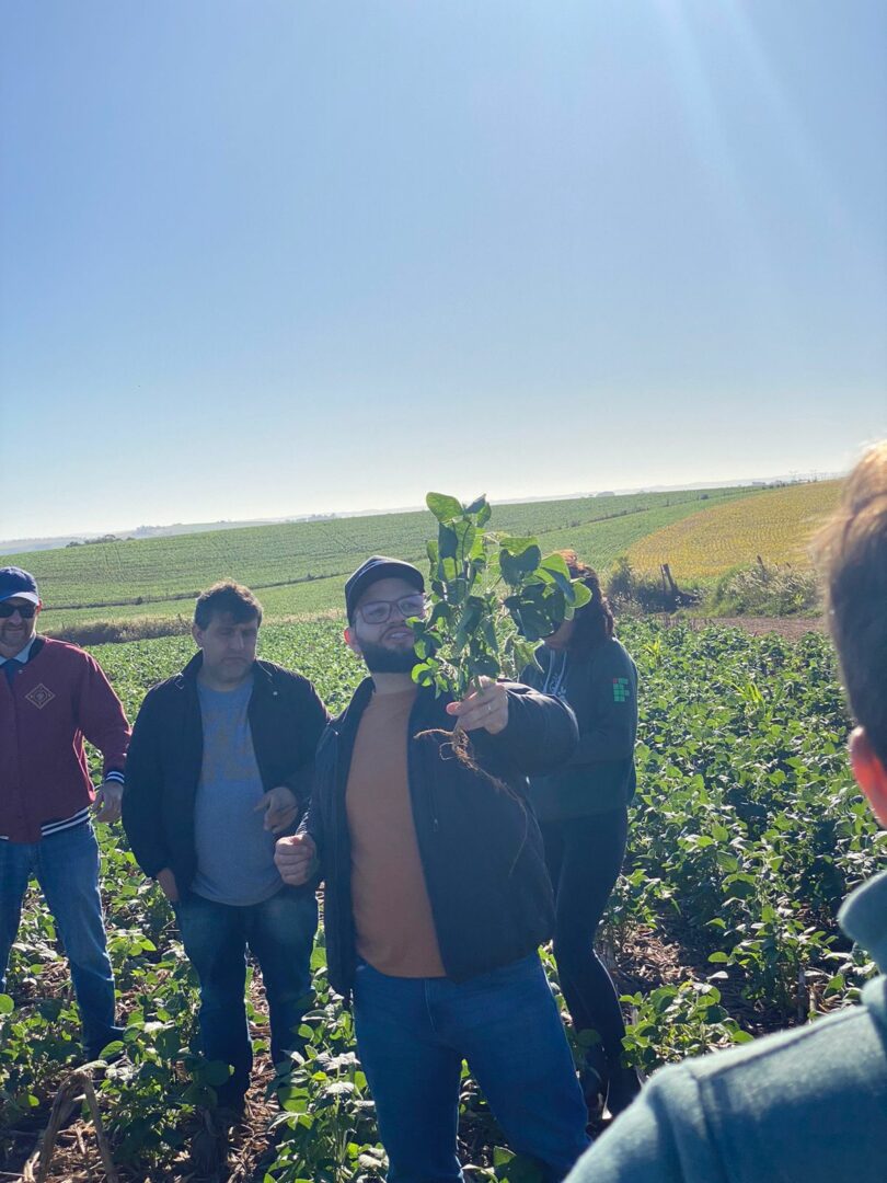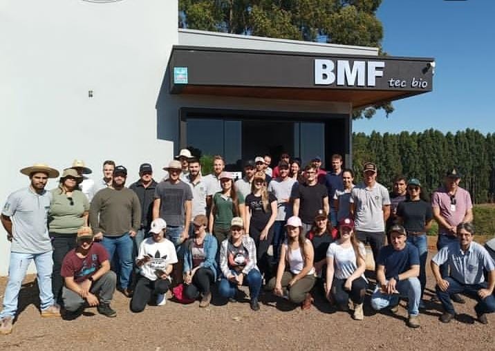 Na primeira visita, em 1º de abril de 2023, fomos recepcionados pelo Engenheiro Agrônomo Alexandre Bourscheid, um dos sócios da empresa BMF Orgânicos Yucumã que presta assistência técnica e fornece bioinsumos aos produtores da região, com abrangência de 15.000 ha. Na oportunidade, foi apresentado aos alunos do IFRS Campus BG o funcionamento e o portfólio da empresa, aproximando o conhecimento teórico com a prática.