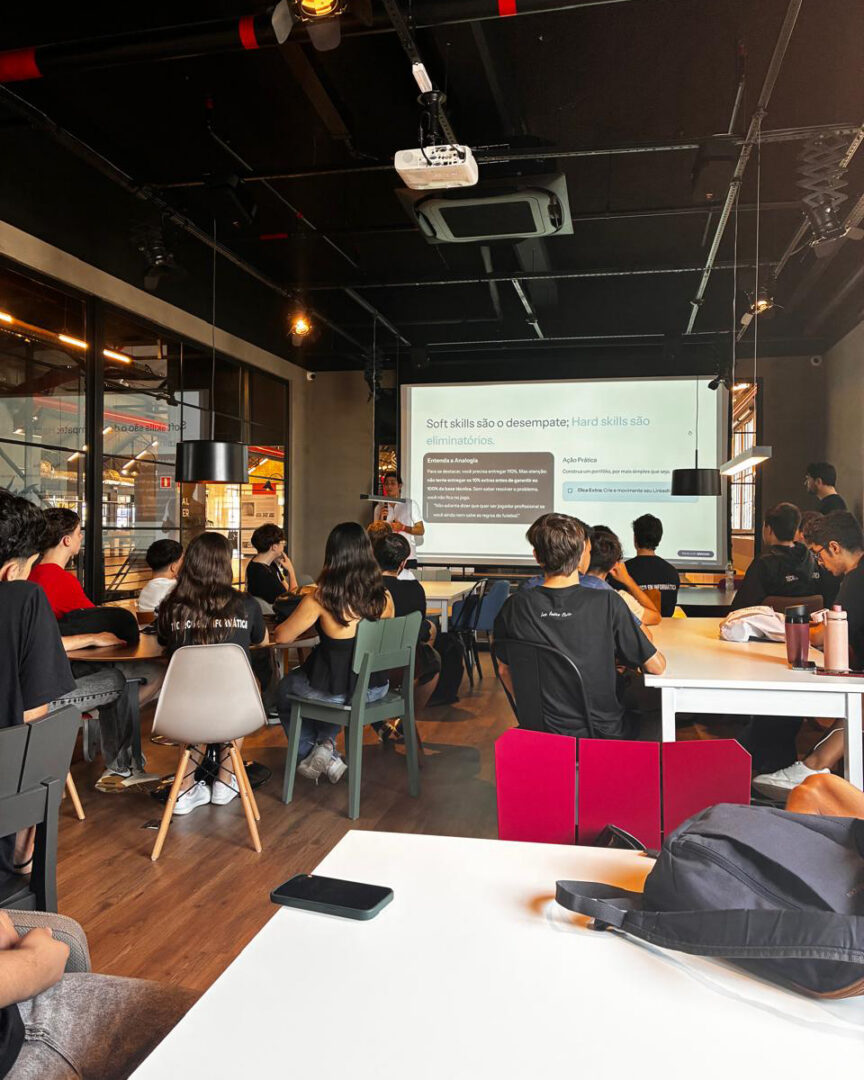 A primeira etapa da visita ocorreu no Instituto Caldeira, reconhecido como um dos principais hubs de inovação da América Latina. Os estudantes participaram de um tour guiado pelas instalações, conhecendo o ambiente que reúne empresas de tecnologia, startups e iniciativas voltadas à inovação. Durante a visita, puderam observar na prática o funcionamento de um ecossistema colaborativo, compreendendo a importância da integração entre educação, tecnologia e mercado.